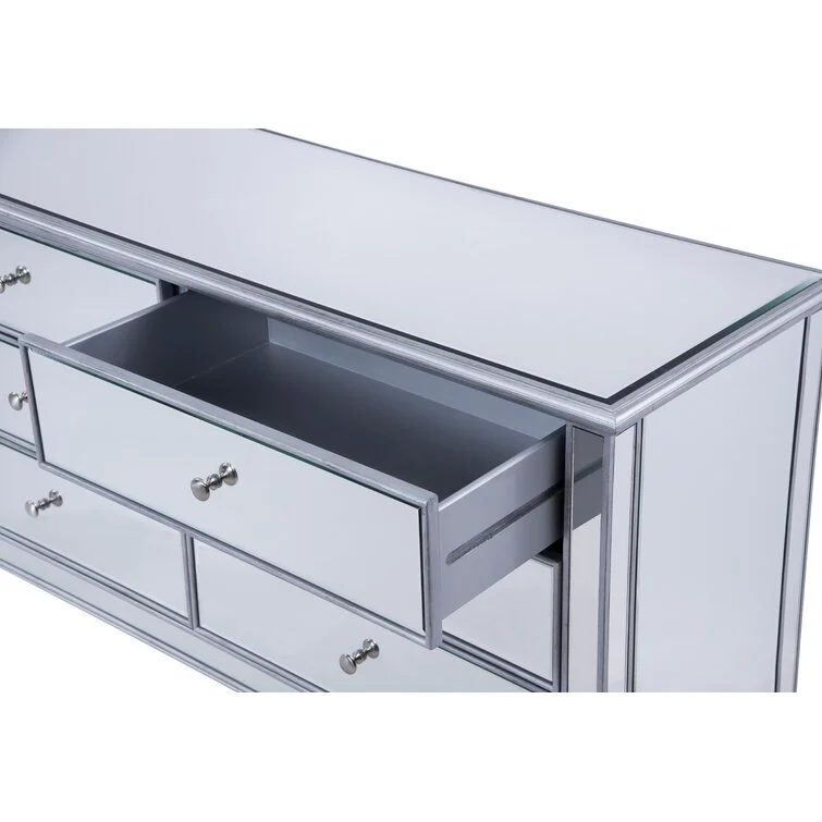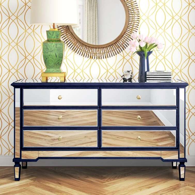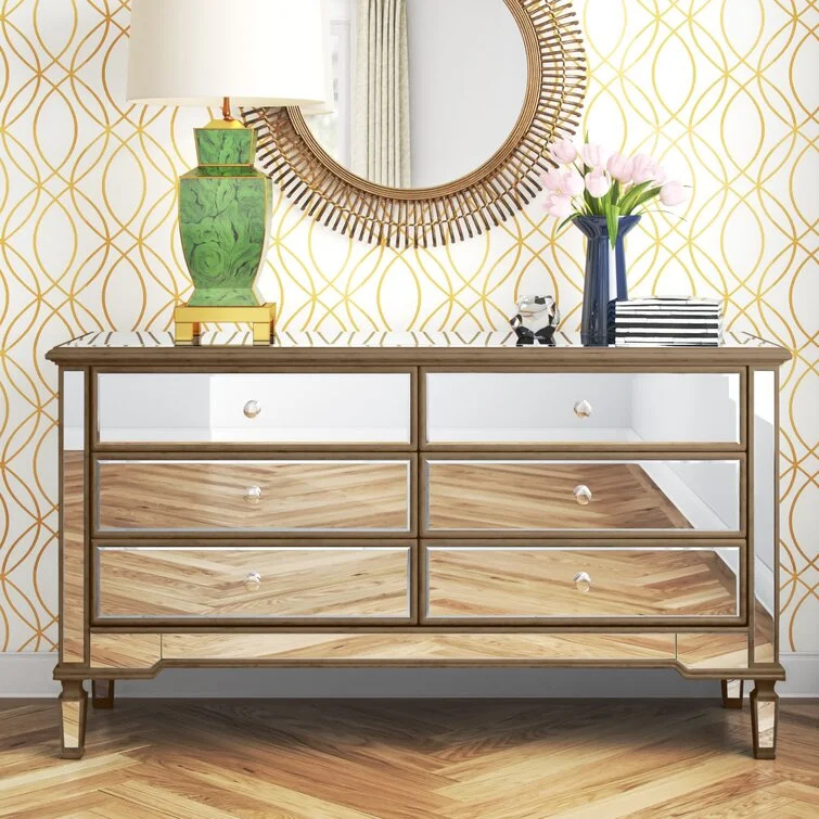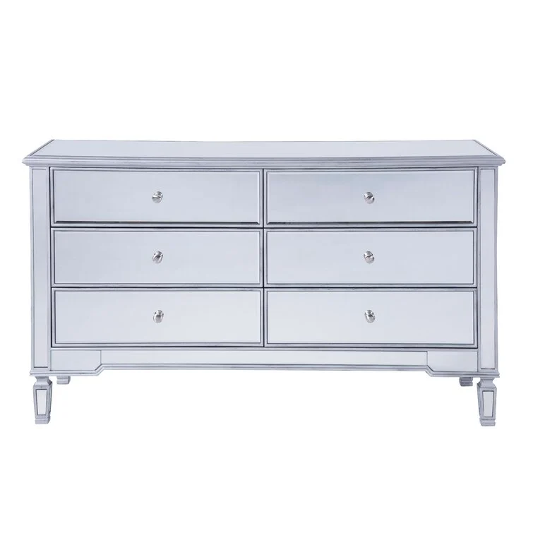 This 6-drawer dresser makes a glam statement in your bedroom while also adding essential storage space. It has a solid and engineered wood frame that rests on four tapered legs. Plus, it features a hand-rubbed antiqued finish with mirrored panels on all sides to scatter light throughout your room for a wide-open feel. Six drawers with handles provide a place for your entire wardrobe, while the top leaves room to show off framed family photos or artful accents. A wall anchor is also included for added safety.