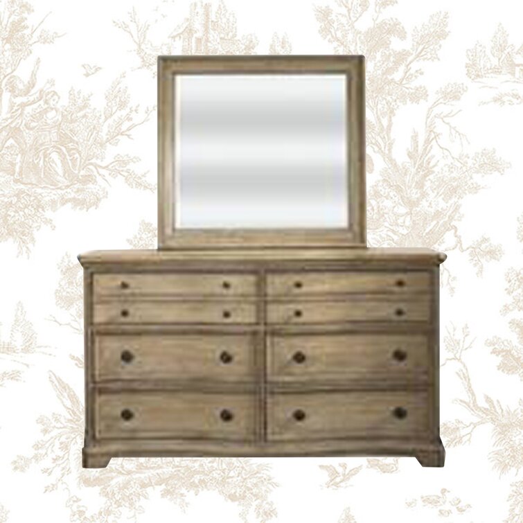 This 6-drawer double dresser brings some French country appeal to your bedroom, with its distinctive silhouette and contrast between hardware and finish. It's made from solid and engineered wood in a neutral finish, with wood grain color variation for a more natural-looking appearance. This dresser features molding and a concave front profile that gives it extra character. Six dovetailed drawers open to reveal plenty of space for your entire wardrobe, while the top two rows are felt-lined to protect more delicate items. There's also a wall anchor included for added safety.