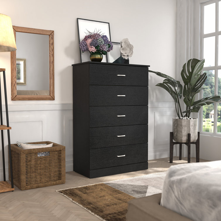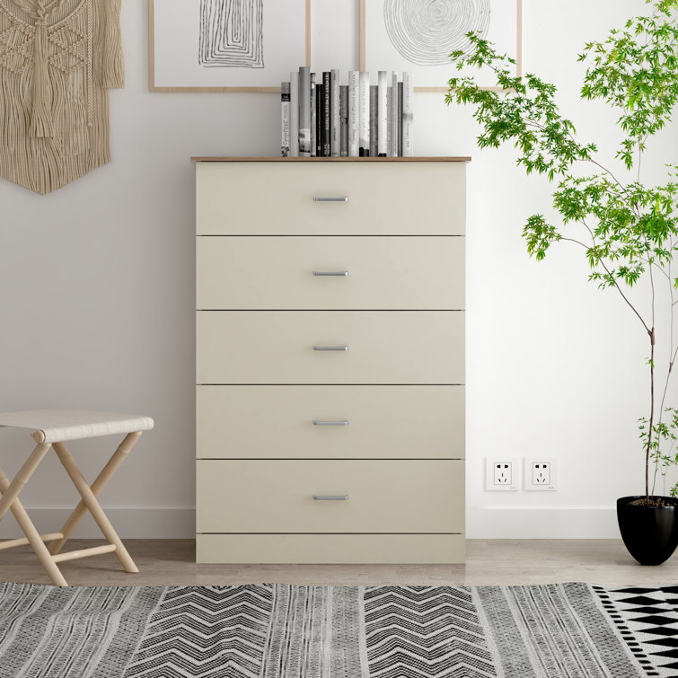This 5-drawer dresser delivers sleek materials and a clean-lined look. It's built from engineered wood with a neutral finish, and it features a streamlined rectangular design. The five stacked drawers provide a place for everything from sweaters to denim, and its top surface easily holds a couple of decor items. Plastic drawer pulls and a barely-there plinth base round out the modern look. Plus, a wall anchor is included for added safety.