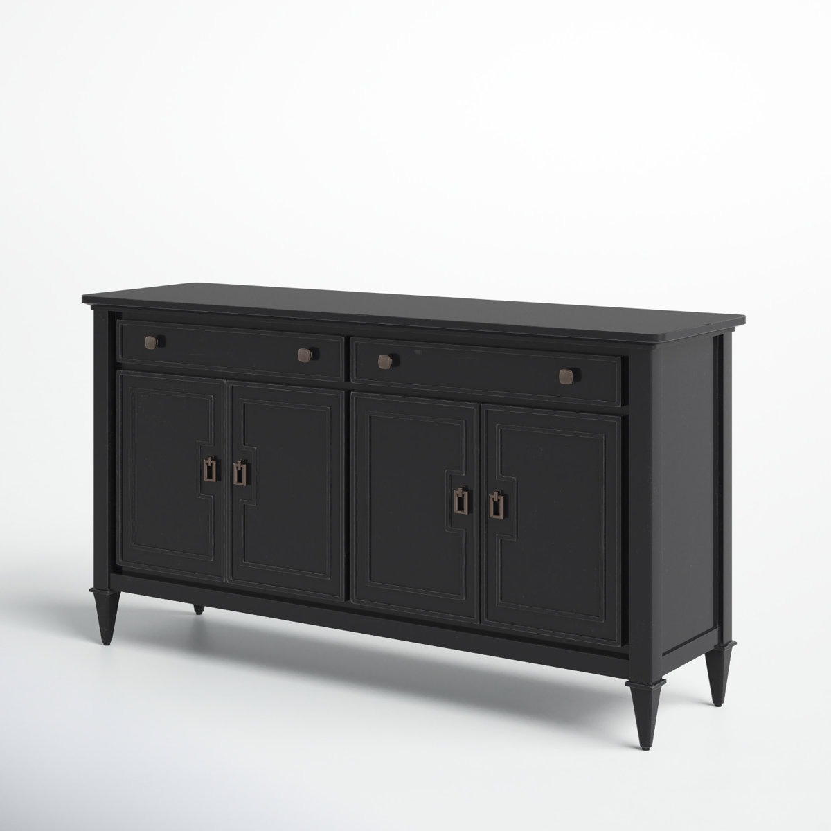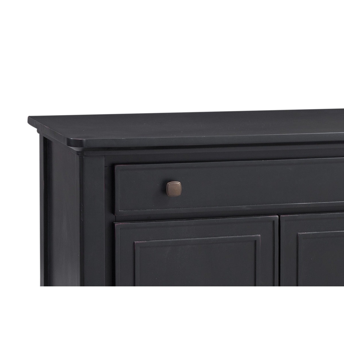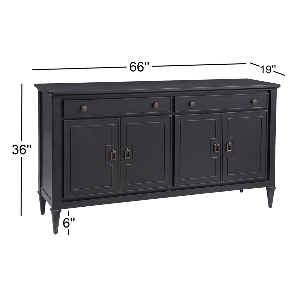 Keep your living room or dining area organized with help from this clean-lined sideboard. It's crafted from solid and engineered wood with a black-on-black finish that works nicely with various styles and color schemes. We especially love the geometric detailing on the four cabinet doors and two upper drawers. Metal square and latch hardware makes it easy to open this buffet and access all the contents within. The spacious top is a great coffee station or locale for apps and desserts. A wall anchor is included with this server for extra safety and stability.