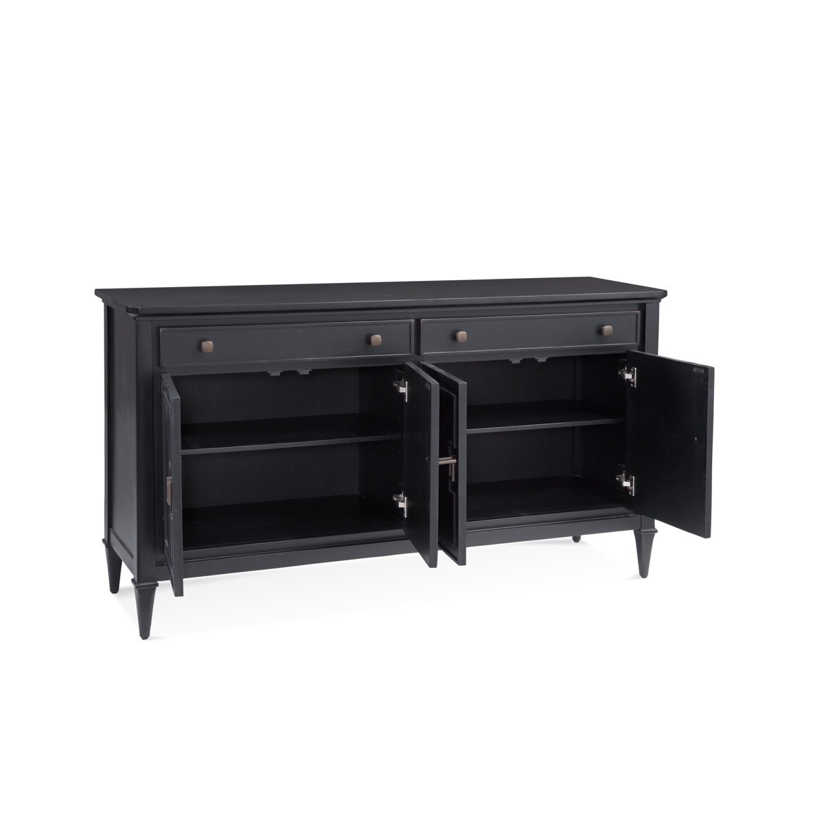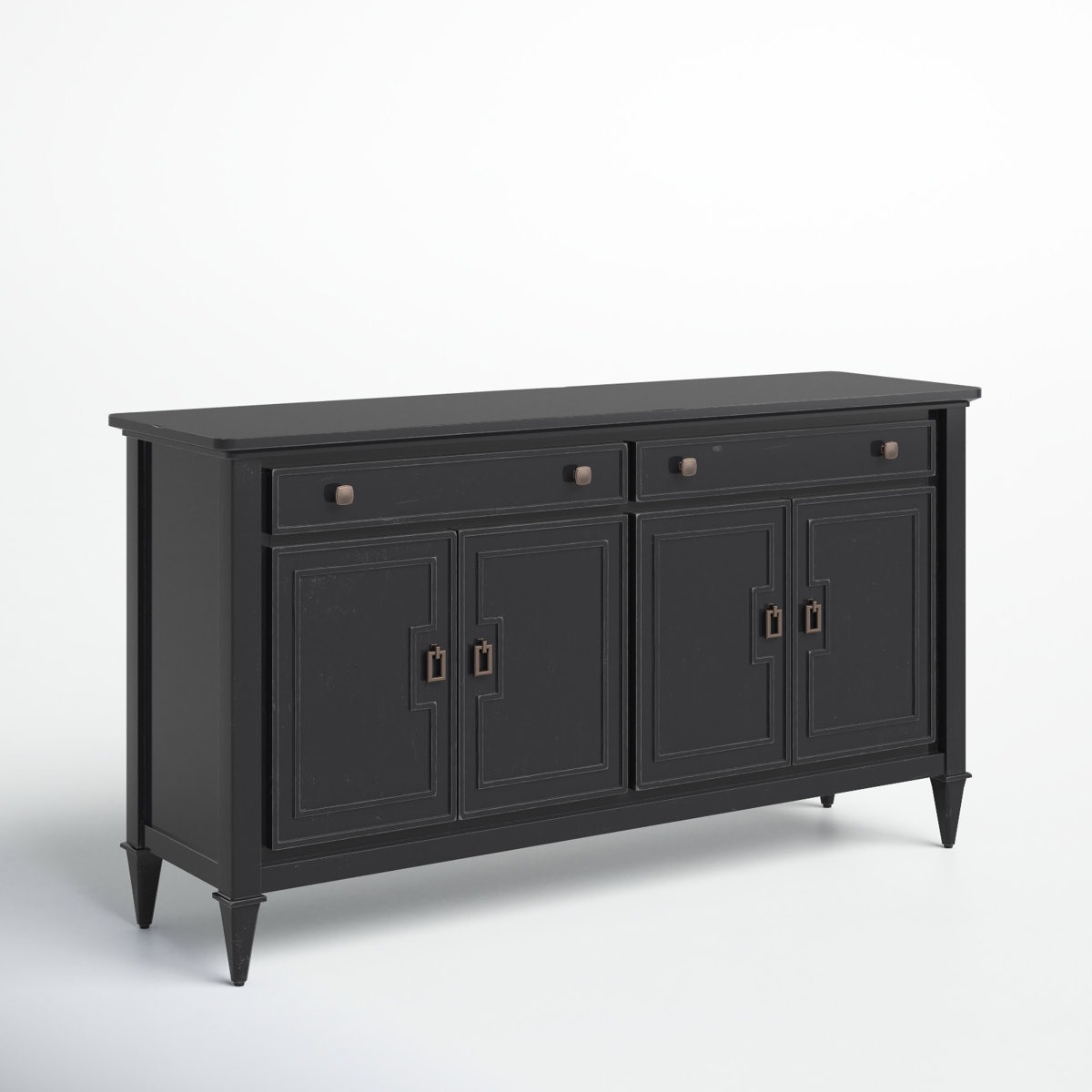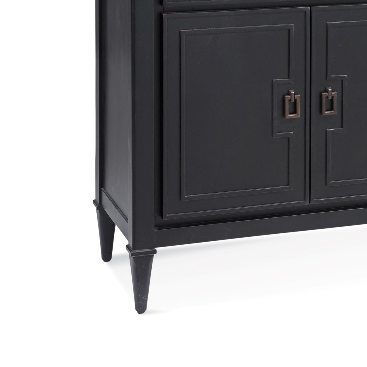 Keep your living room or dining area organized with help from this clean-lined sideboard. It's crafted from solid and engineered wood with a black-on-black finish that works nicely with various styles and color schemes. We especially love the geometric detailing on the four cabinet doors and two upper drawers. Metal square and latch hardware makes it easy to open this buffet and access all the contents within. The spacious top is a great coffee station or locale for apps and desserts. A wall anchor is included with this server for extra safety and stability.