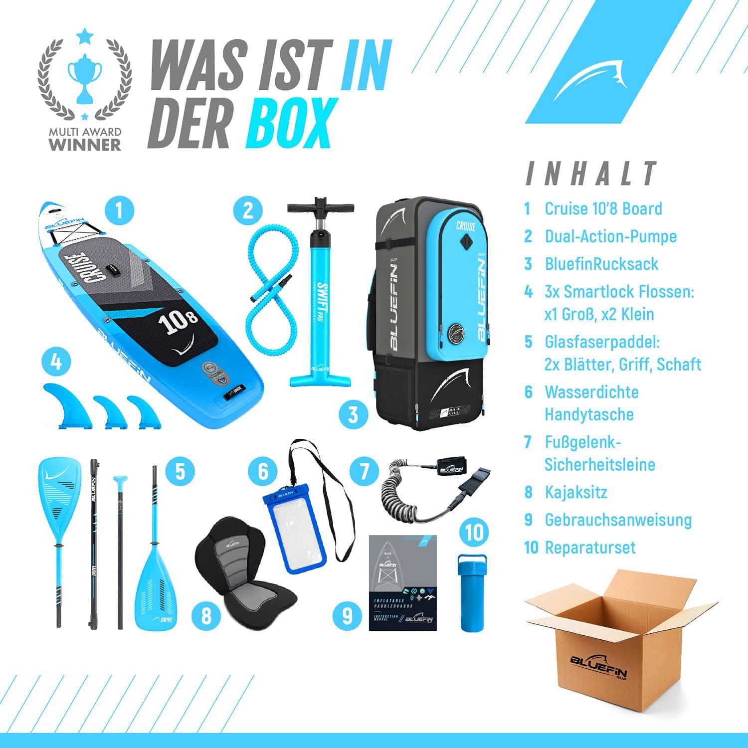 | enthaltene Komponenten | Cruise 10'8 Brett, Dual-Action-Pumpe, Reperaturset, Kajaksitz, Telefontasche, Robuster Rucksack, Knöchelleine, Paddel aus Fiberglas, Smart Lock-Flossen, Bedienungsanleitung |