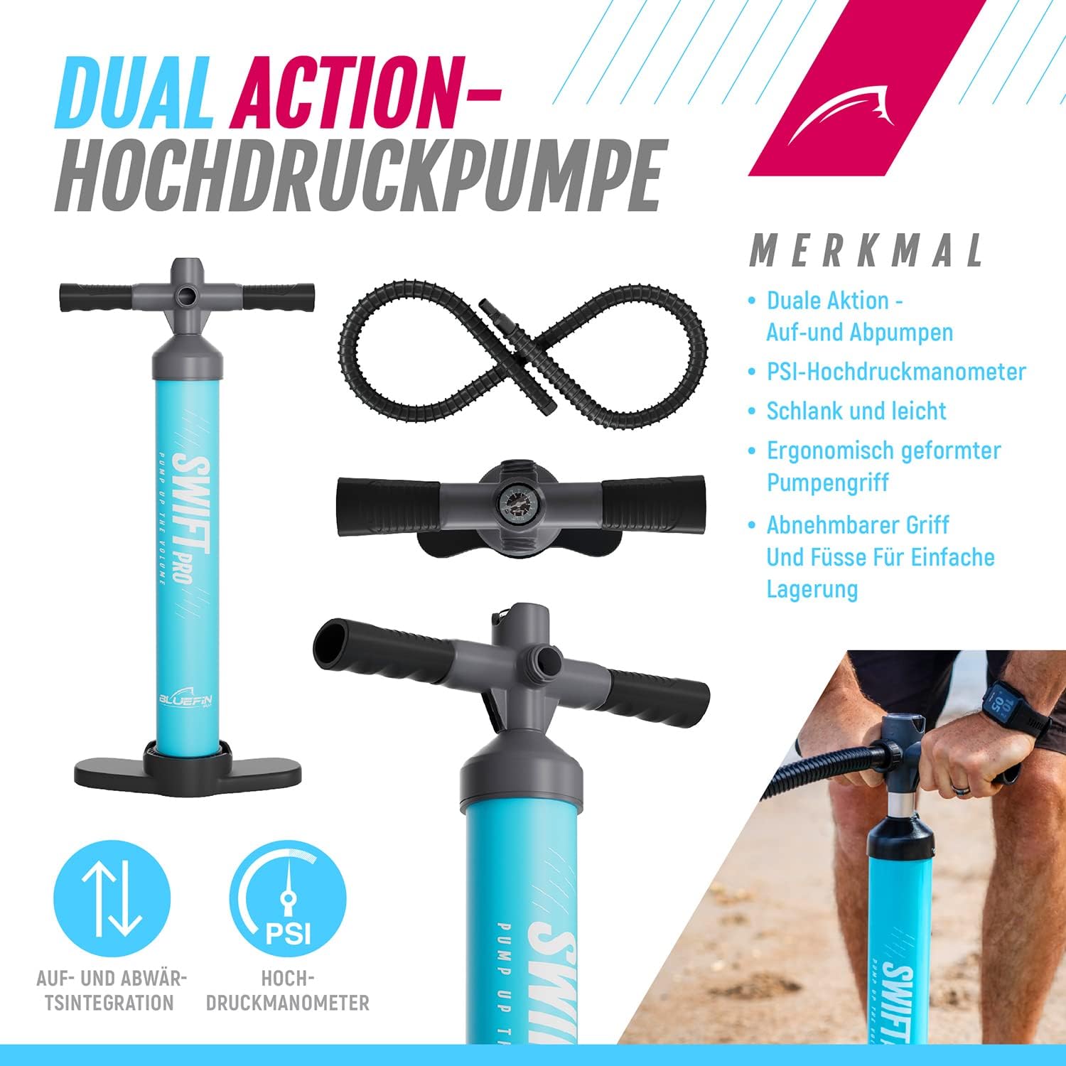 SWIFT PRO EINKAMMERPUMPE. Macht das Aufpumpen und Entleeren deines SUPs zum Kinderspiel. Diese Pumpe verfügt über eine Einzel- und eine Dual-Action-Option zum schnellen Aufpumpen. Abnehmbare Griffe machen diese Pumpe noch kompakter und tragbarer.