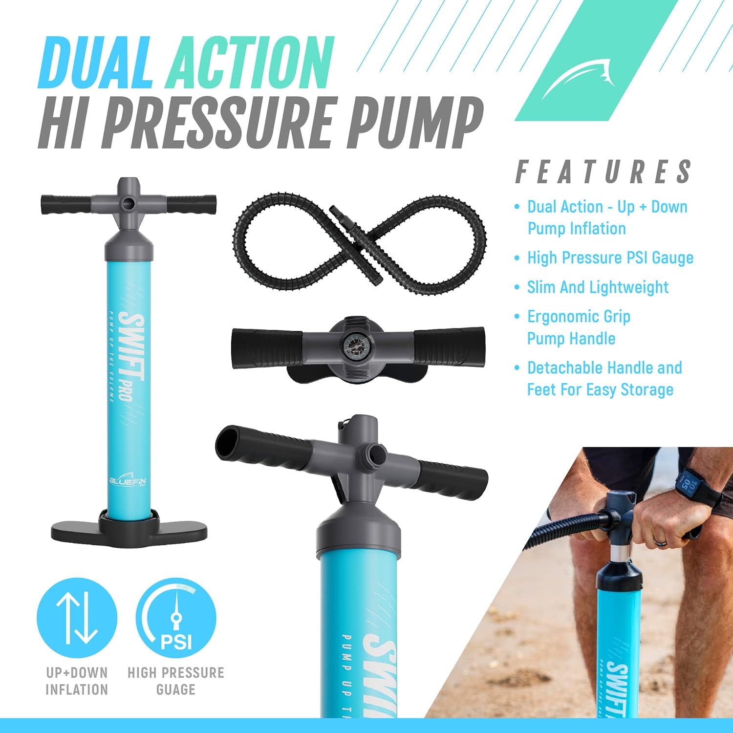 SWIFT PRO EINKAMMERPUMPE. Macht das Aufpumpen und Entleeren deines SUPs zum Kinderspiel. Diese Pumpe verfügt über eine Einzel- und eine Dual-Action-Option zum schnellen Aufpumpen. Abnehmbare Griffe machen diese Pumpe noch kompakter und tragbarer.