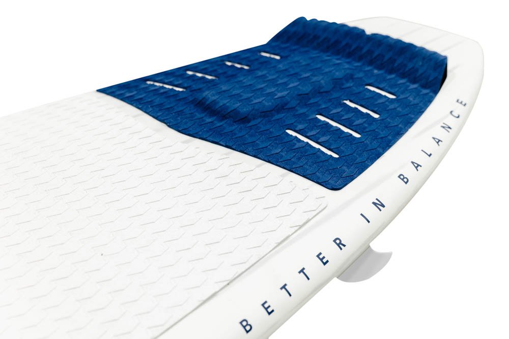Tail mounted traction pad with center support arch bar for maximum grip during those high performance carves on the wave face. The slight kick tail on the deck pad helps the rider maximize the full performance of each turn.