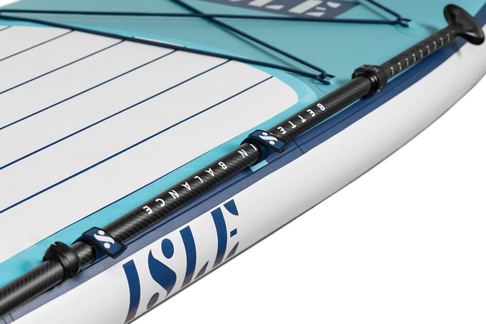 Two Velcro straps along the rail of the board allows for secure attachment points for your paddle while not in motion.