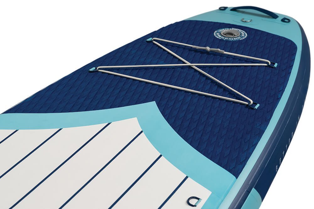 The Explorer was designed for those adventurous paddlers. This board excels on flatwater; from still lake water to fast-paced rivers, this board will maneuver seamlessly. Its pointed nose is built to cut through tough waters and has a reinforced grab handle that is great for portability. It also has additional storage space, with both a six-point front bungee system and a four-point rear bungee system to be sure you can bring along all of your fishing gear or any paddle board accessories for a lengthy ride.