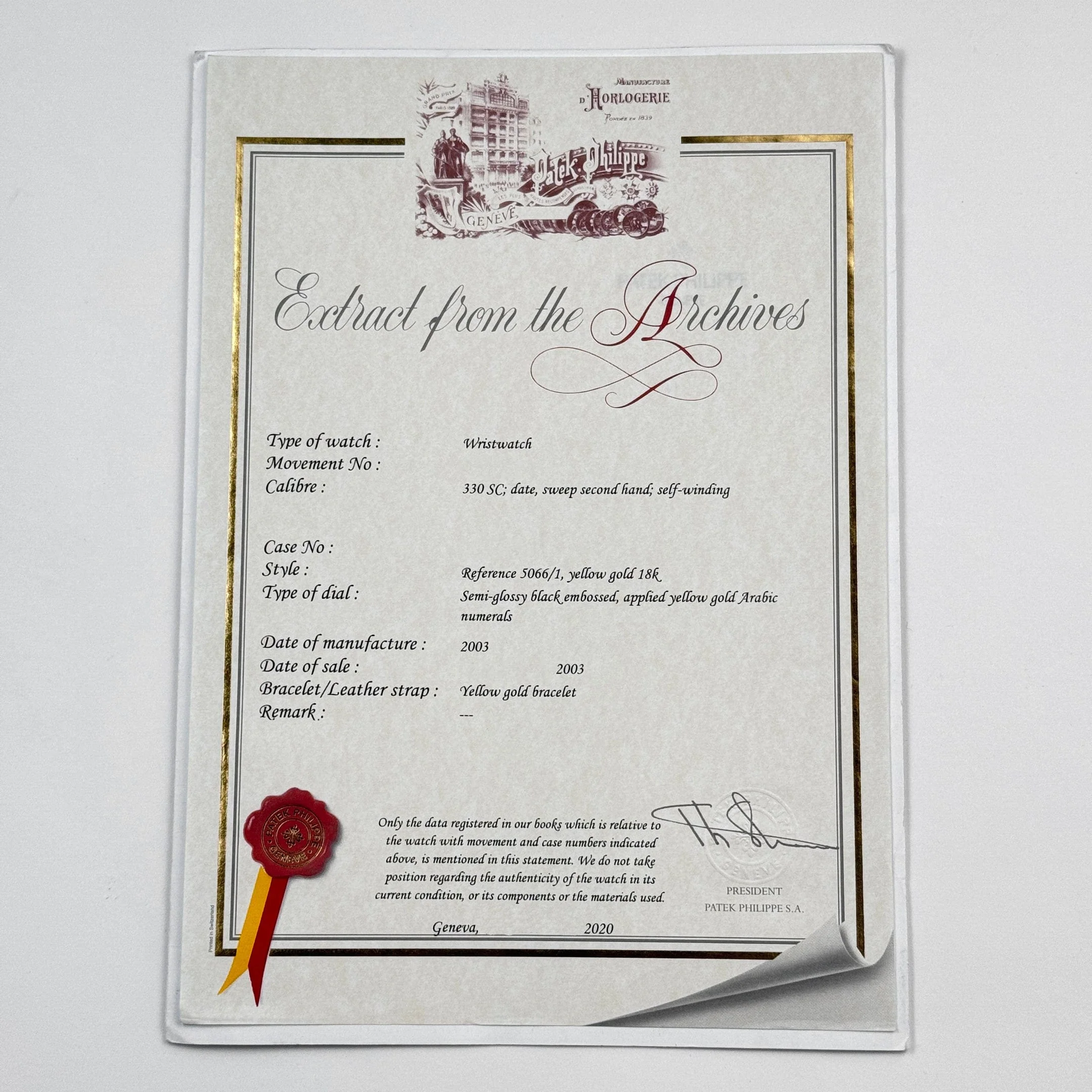 The Patek Philippe 5066/1J Yellow Gold Black Dial is a luxurious 34mm timepiece crafted in yellow gold, featuring a striking black dial with gold-toned markers and hands. Powered by the precise Caliber 330 SC automatic movement, it includes a practical date function at 3 o'clock. The watch��s refined design is completed with a yellow gold bracelet, blending sporty and classic elements to create a versatile and timeless piece suitable for various occasions.