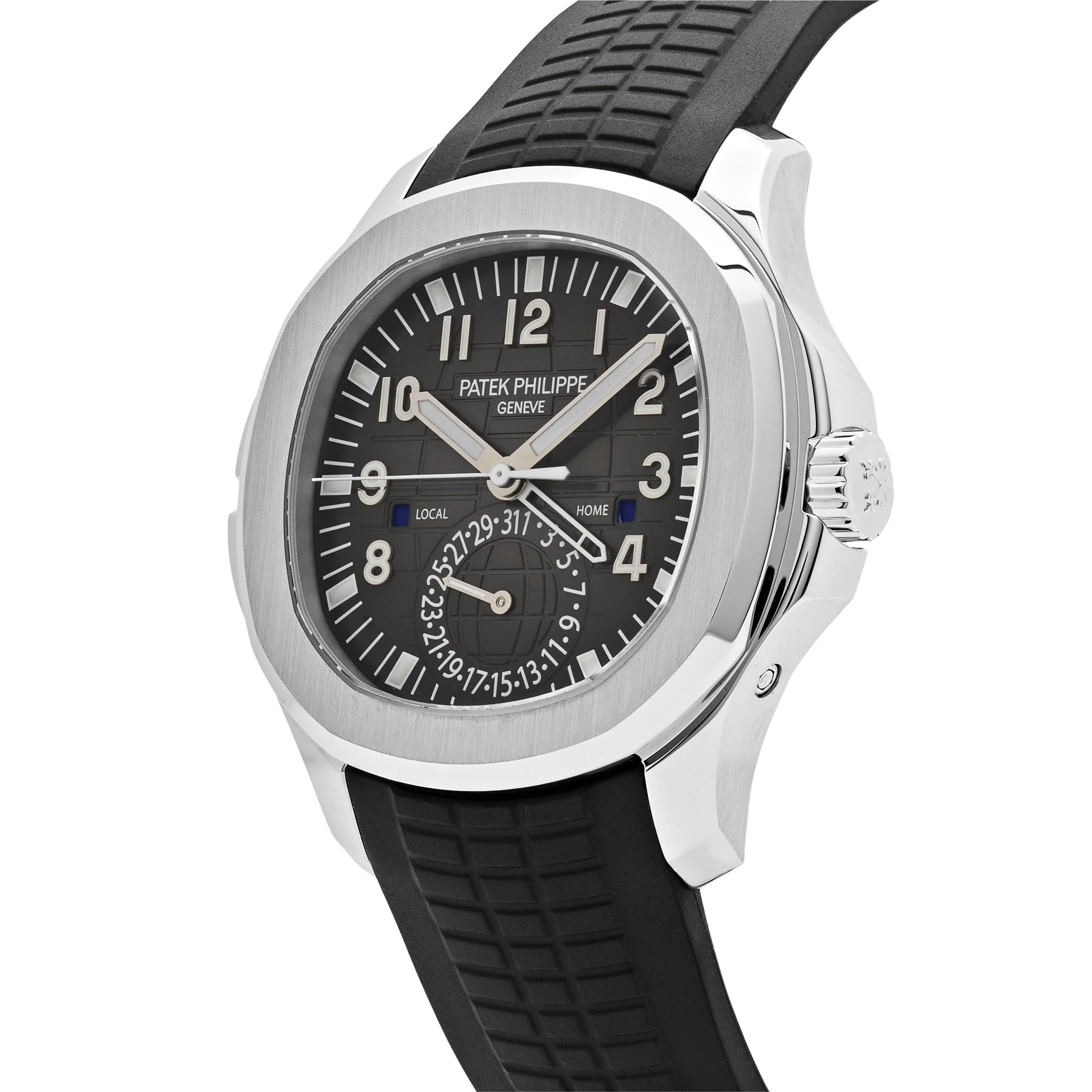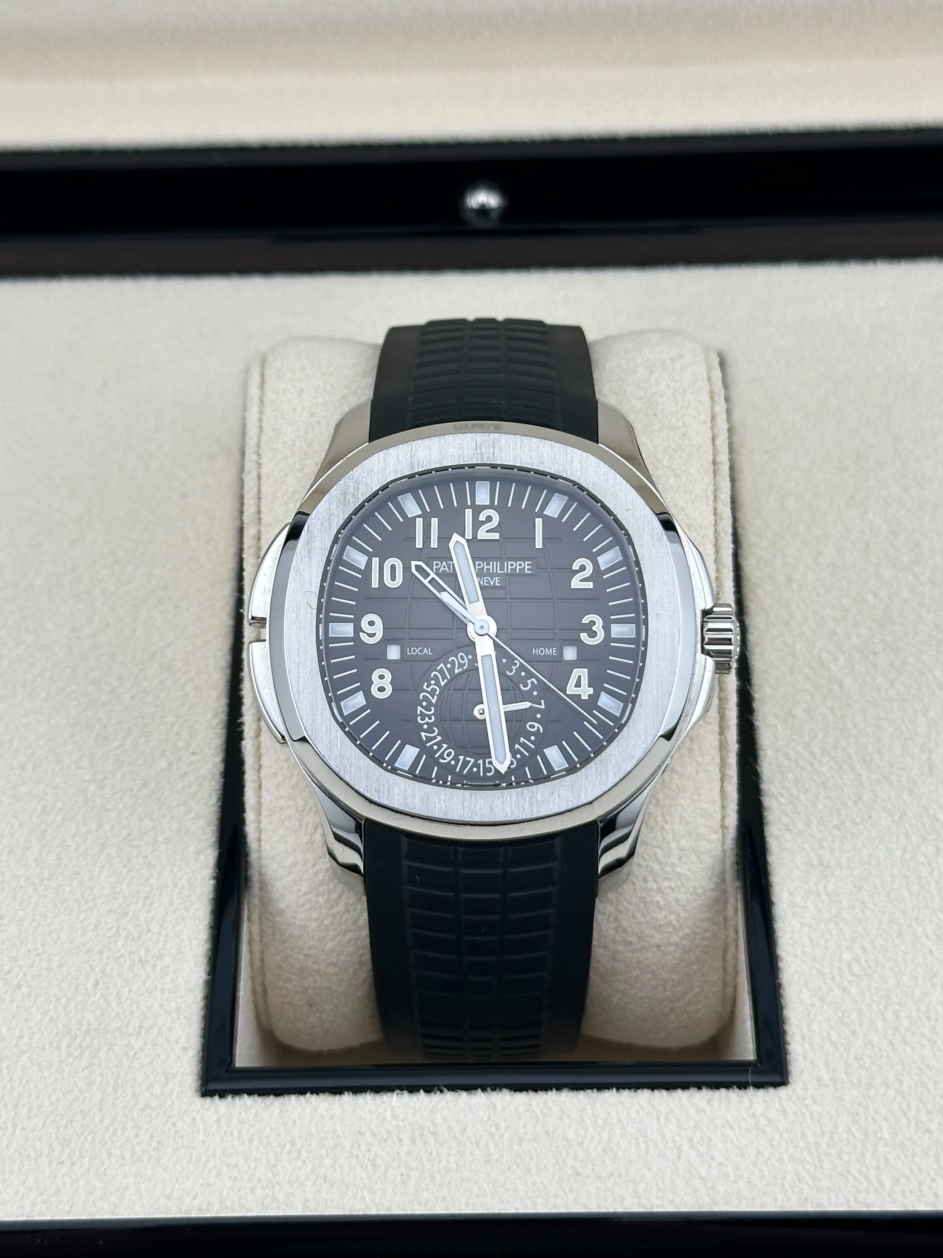 This Patek Philippe 5164A-001 'Travel Time' Stainless Steel (2024) is designed in a 40mm stainless steel case featuring a black embossed dial with luminous white numerals. It is protected by a sapphire-crystal case back and housed on a black rubber bracelet and Aquanaut fold-over clasp. Complications include dual time zones with day/night indicators, making this timepiece the perfect travel companion.