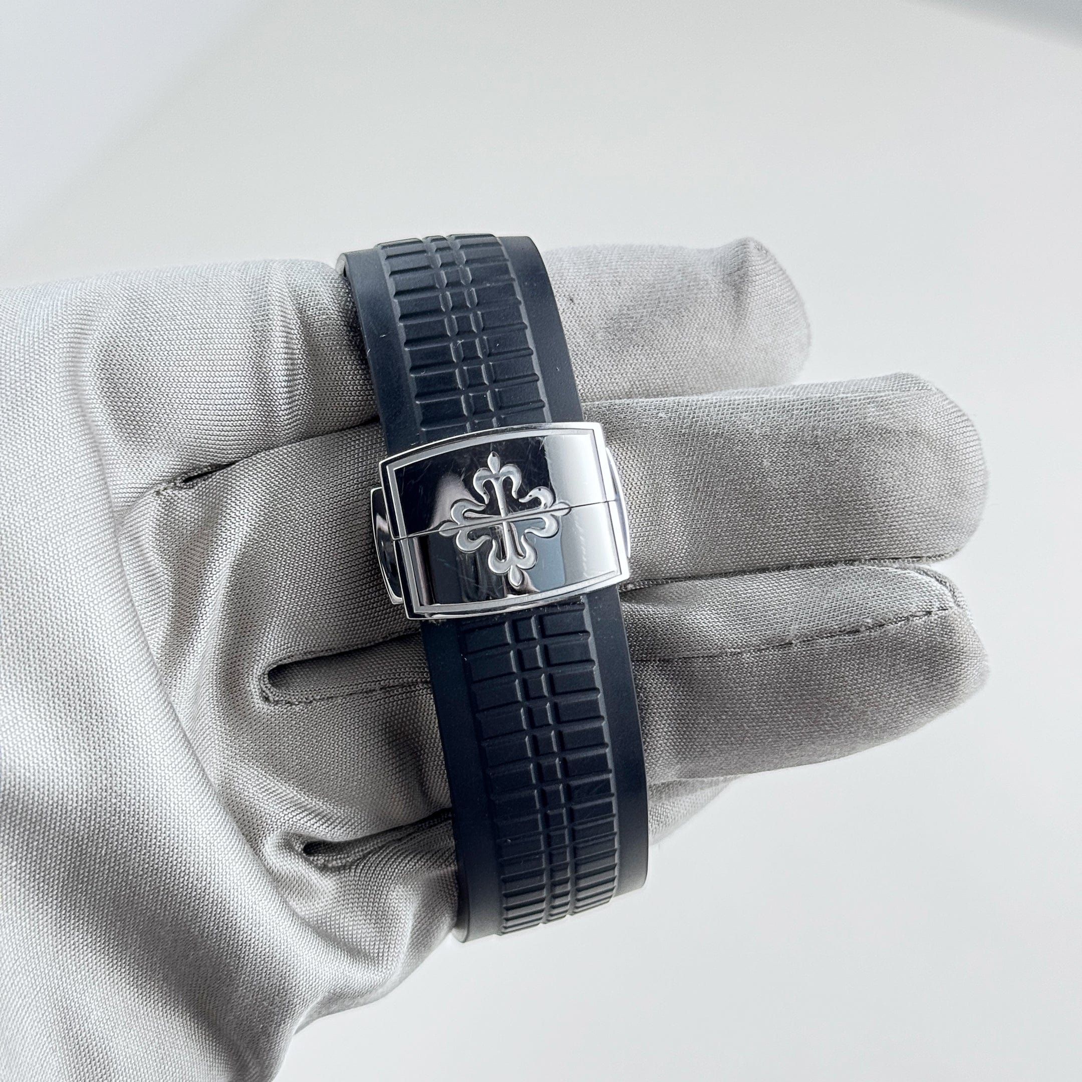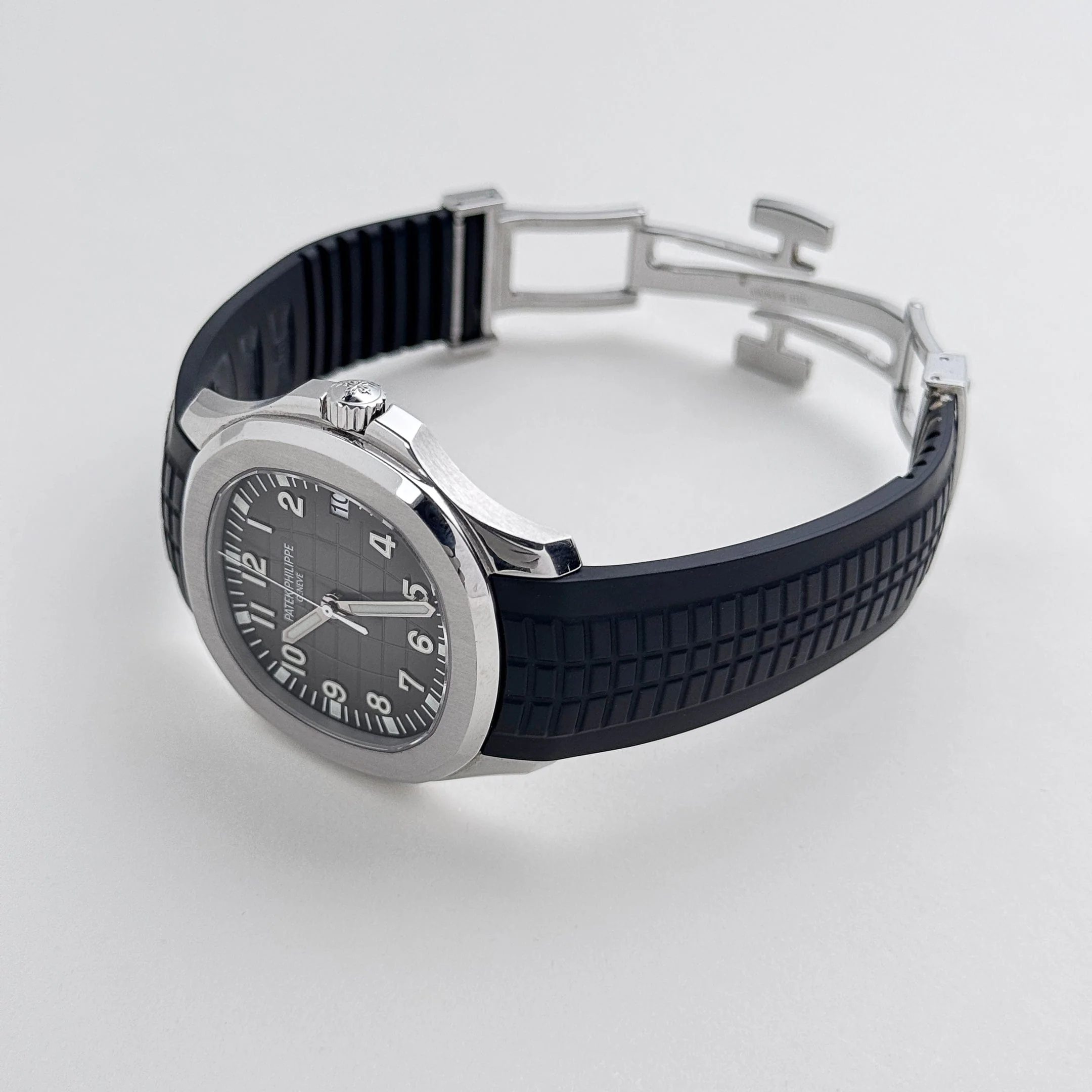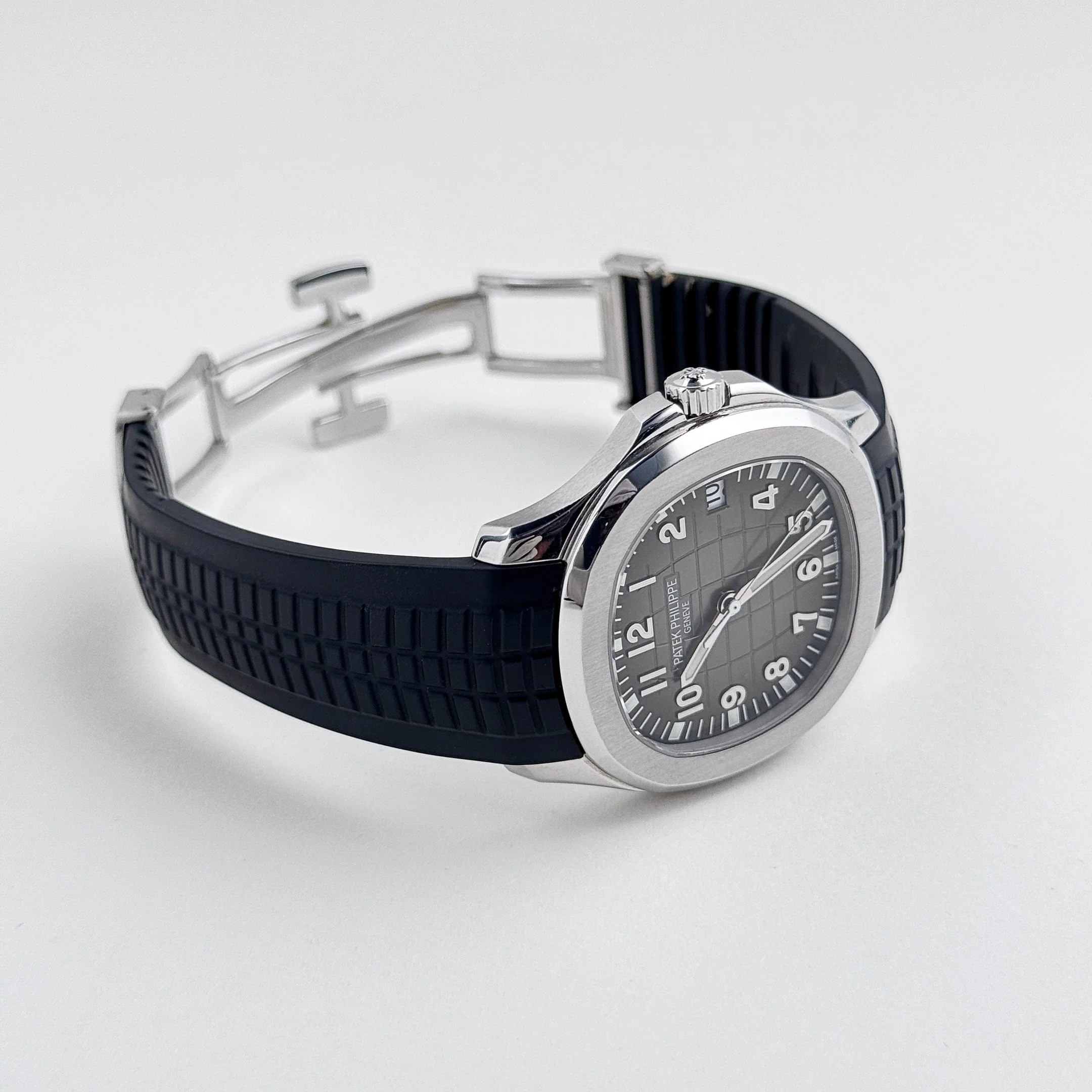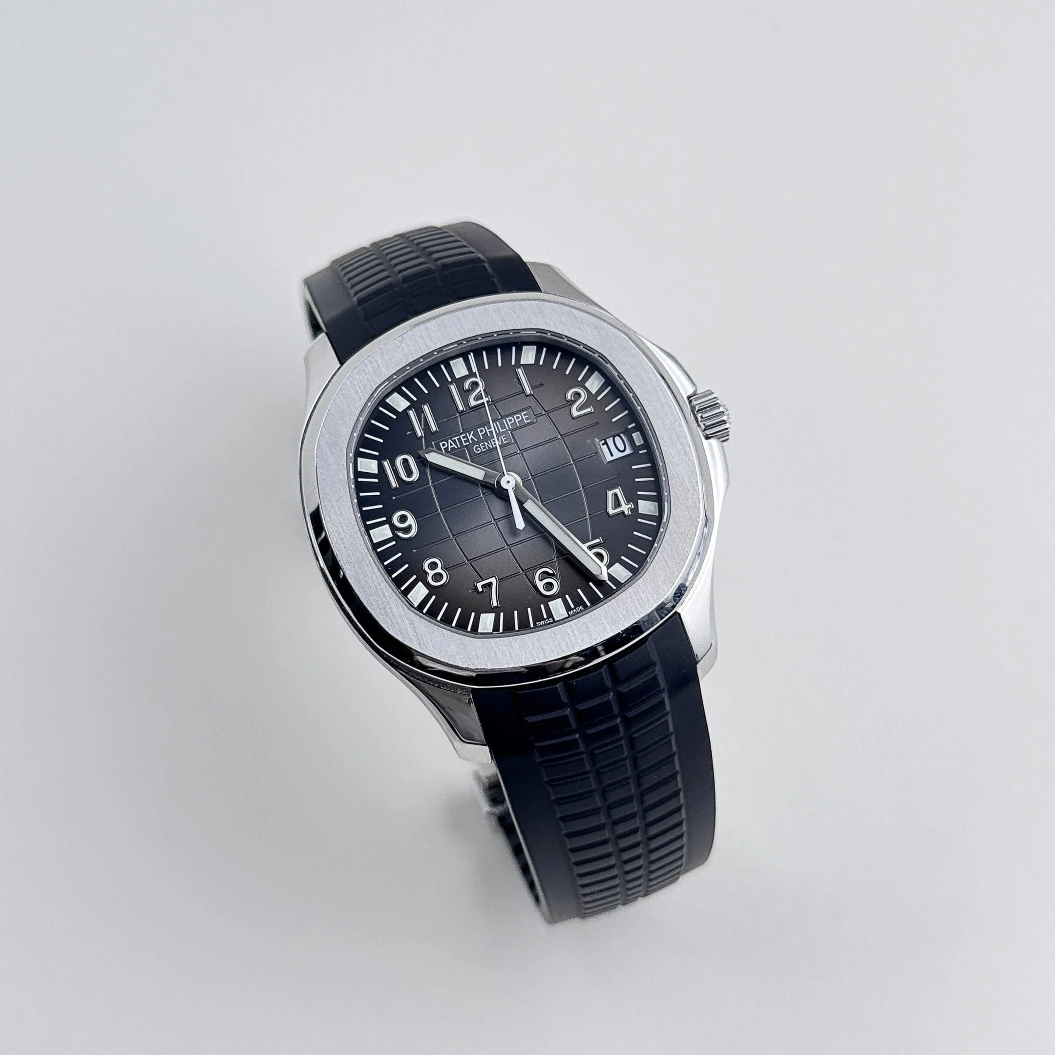 The Patek Philippe 5167/1A-001 is a modern icon of sporty sophistication, crafted in stainless steel. Its 40.8mm case exudes contemporary elegance, while the black rubber strap provides durability. The black embossed dial features the Aquanaut��s signature pattern, adding depth and texture, while white-gold applied hour markers with luminescent coating ensure excellent legibility.