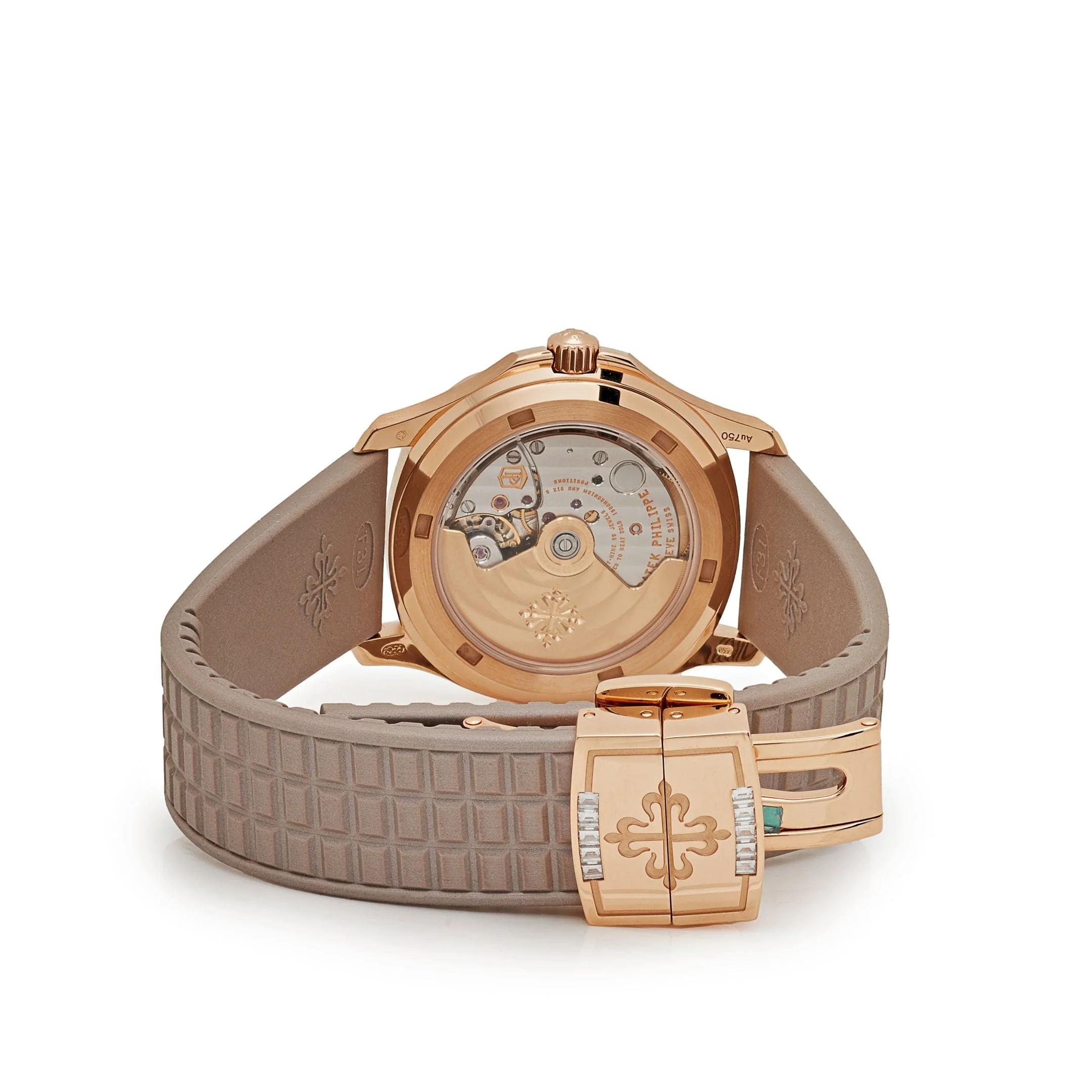 The Patek Philippe Aquanaut Luce 5072R-001 is an exquisite fusion of haute joaillerie and contemporary watchmaking, designed for collectors who seek unparalleled luxury. Crafted in 18k rose gold, this timepiece features a bezel set with 48 brilliant-cut diamonds, framing the signature embossed dial. The dial itself is adorned with an array of diamonds, meticulously placed to enhance its opulent yet refined appearance.