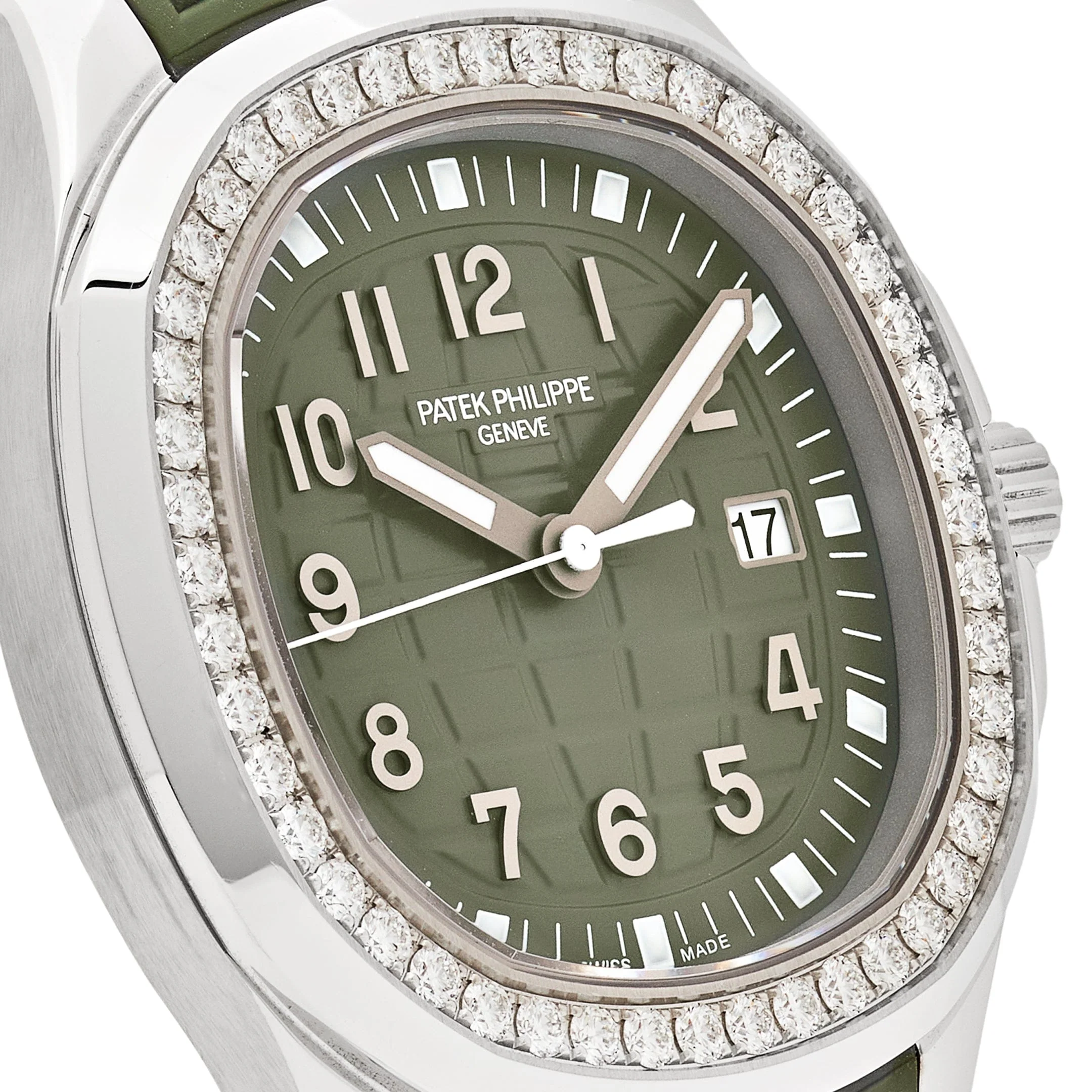 Patek Philippe reinterprets the quartz Aquanaut Luce with a larger diameter and a new integrated composite strap. This watch features a 38.8mm stainless steel case, screw-down crown and solid case back. The bezel is lit up by a row of 48 diamonds (~1.11 ct) surrounding the khaki green dial embossed with the Aquanaut pattern. The khaki green rubber strap closes with an Aquanaut fold-over clasp.