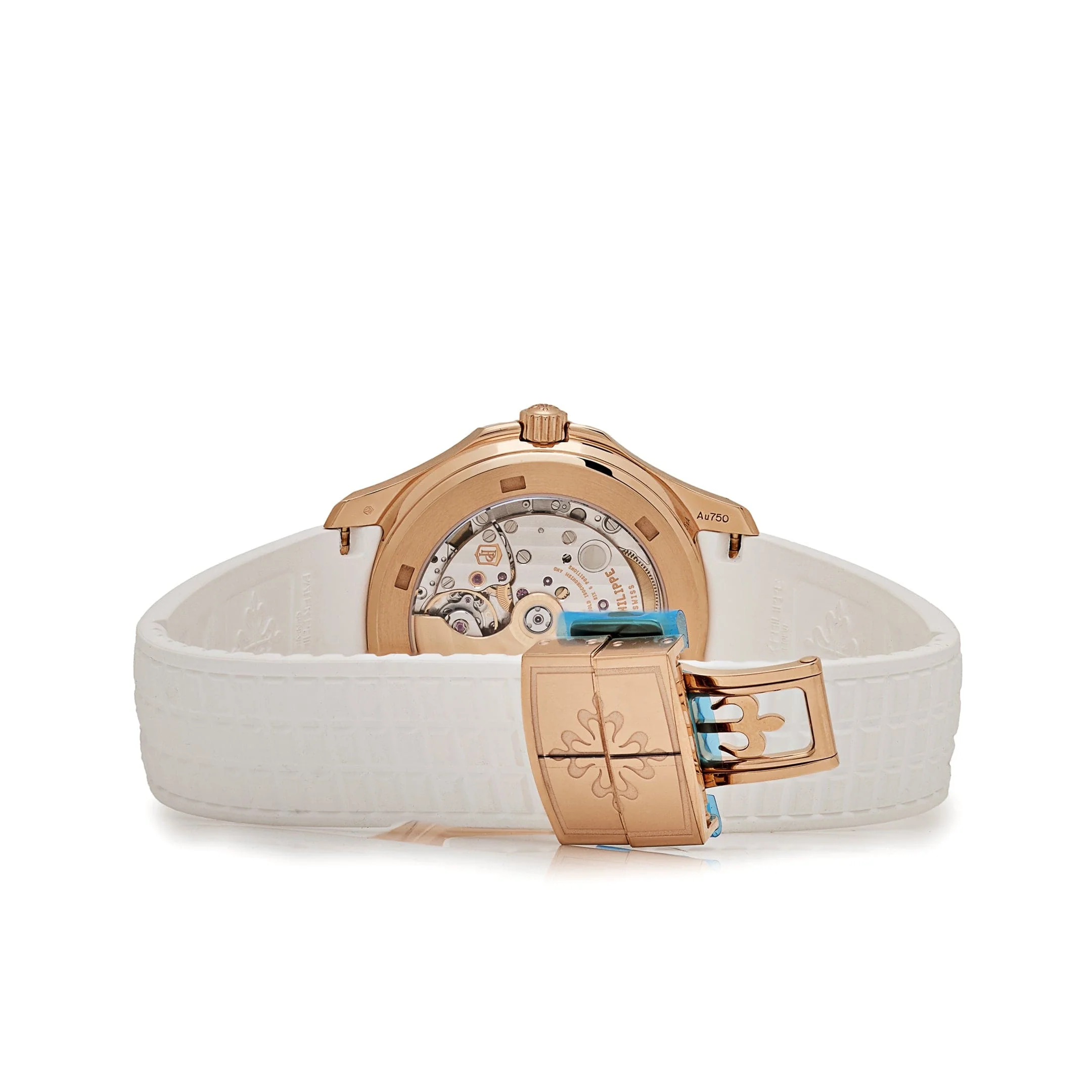 The white embossed dial, featuring the signature Aquanaut pattern, is paired with rose gold-applied hour markers and hands, all coated with luminescent material for effortless legibility. A date display at 3 o��clock seamlessly integrates functionality into the watch��s clean design.