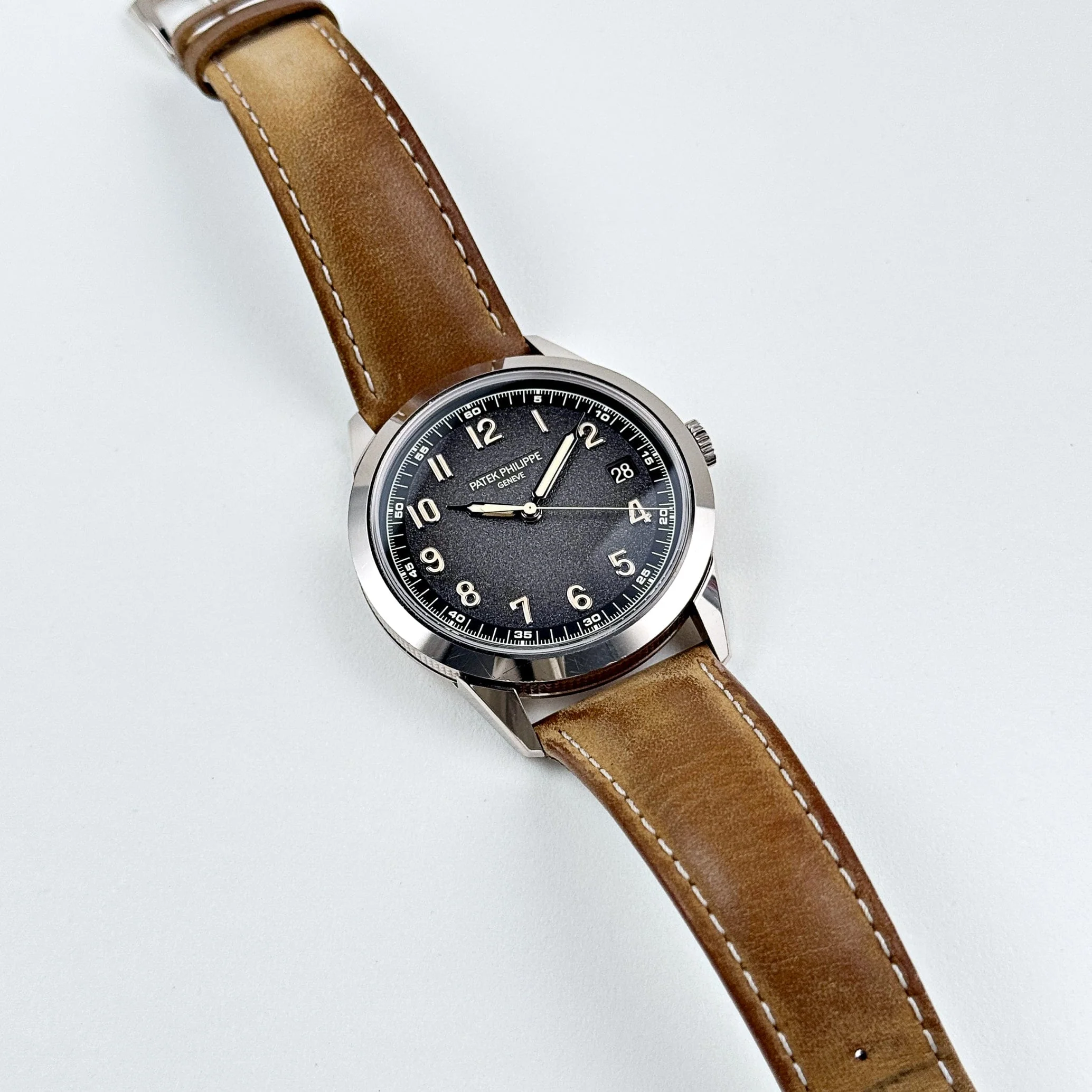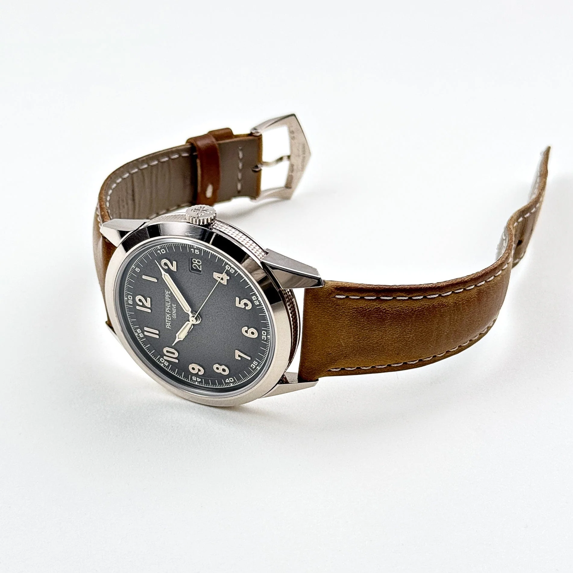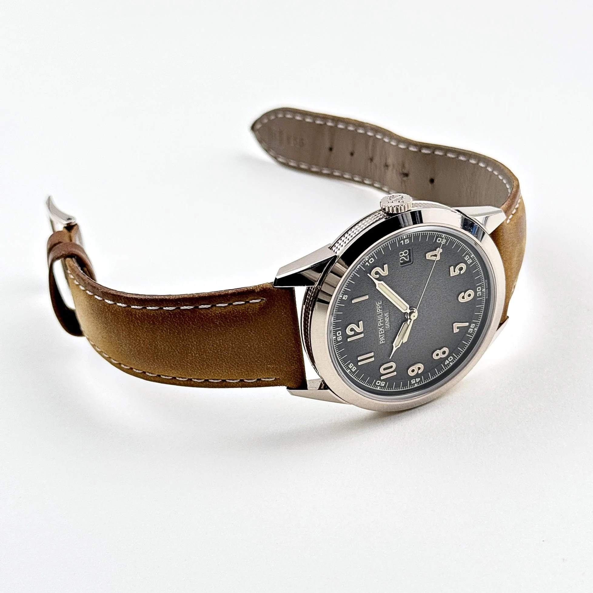 The charcoal gray dial with a gradient effect transitions from a lighter center to darker edges, offering depth and modernity. Sandblasted for a refined matte finish, the dial is punctuated by vintage-inspired cream-colored numerals and syringe-style hands, further enhancing its timeless appeal. A discreet date window at 3 o��clock adds practicality without disrupting the harmonious design. Paired with interchangeable beige and black calfskin straps, the 5226G-001 combines versatility with sophistication, making it a must-have for collectors who value understated luxury and Patek Philippe��s impeccable craftsmanship.