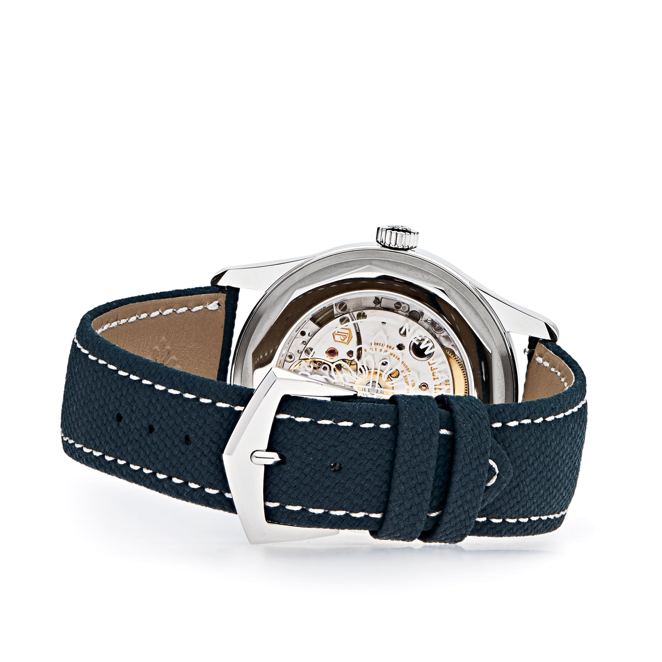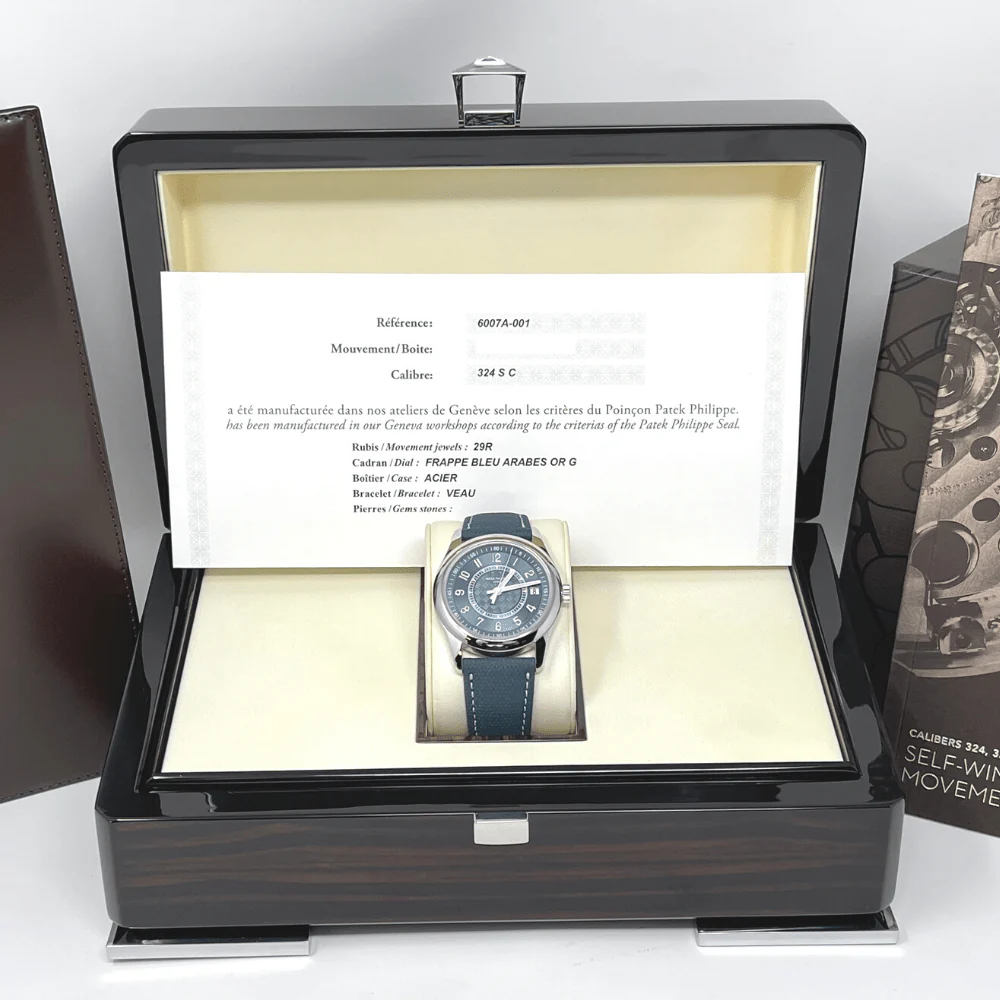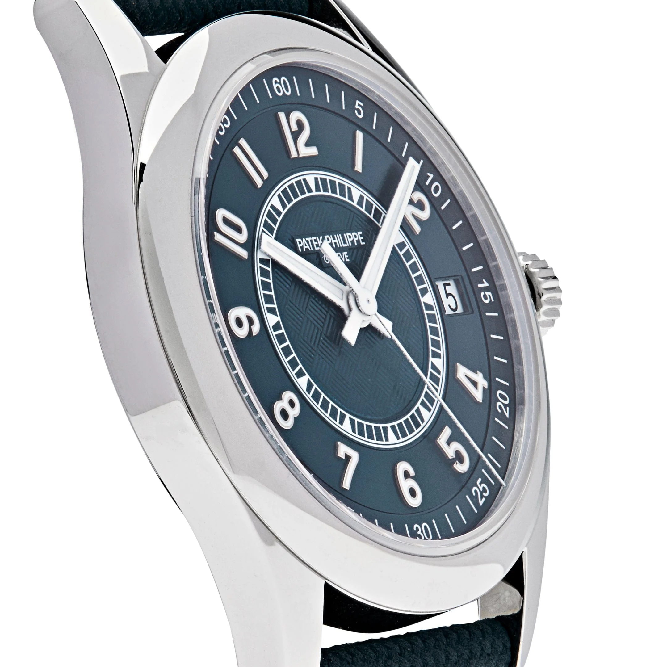 This limited edition Patek Philippe Calatrava watch is�designed in a 40mm stainless steel and sapphire-crystal caseback. It features a grey-blue dial with a ��carbon��-style texture and a broad cambered bezel in polished steel. It is finished with a calfskin embossed gray-blue strap with a prong buckle.