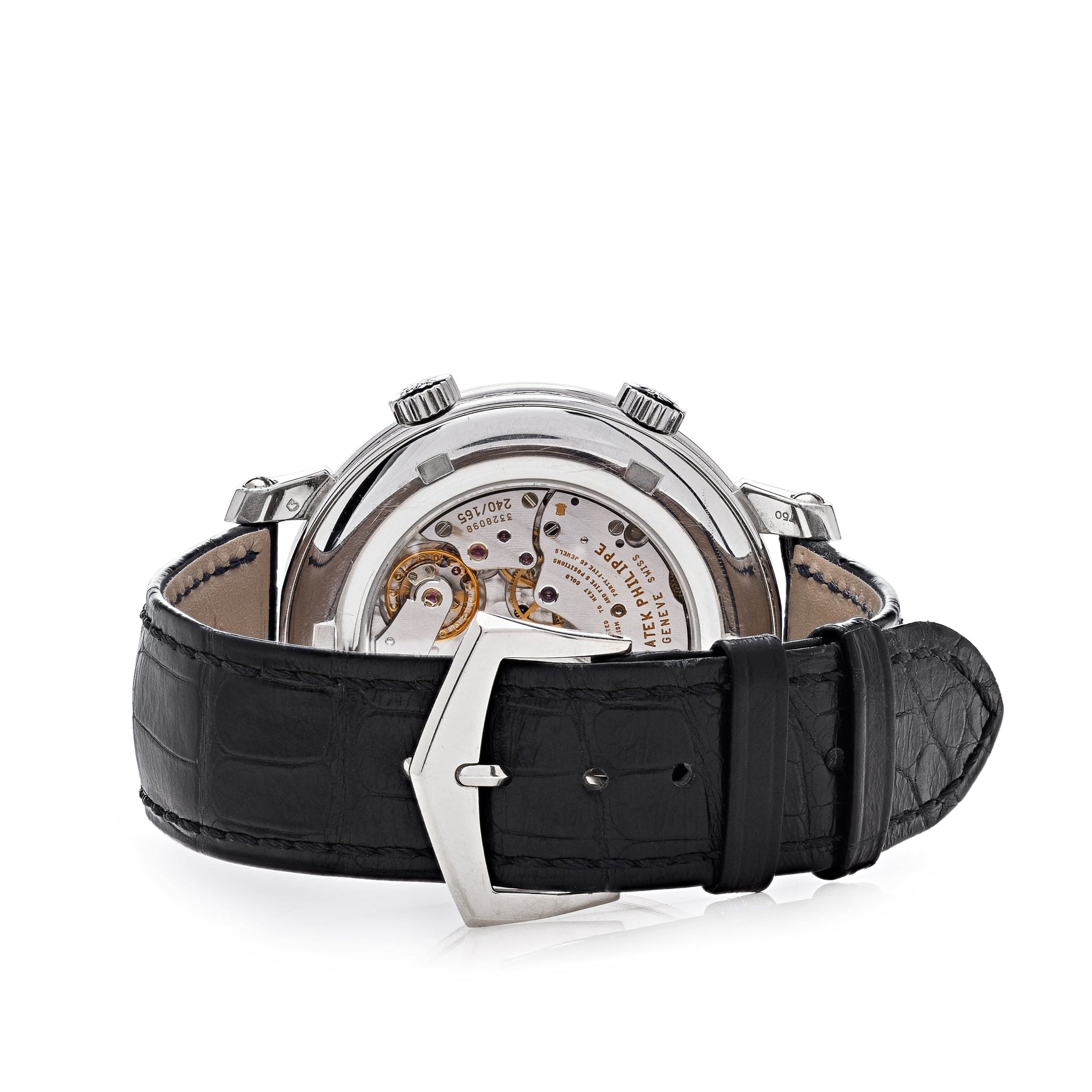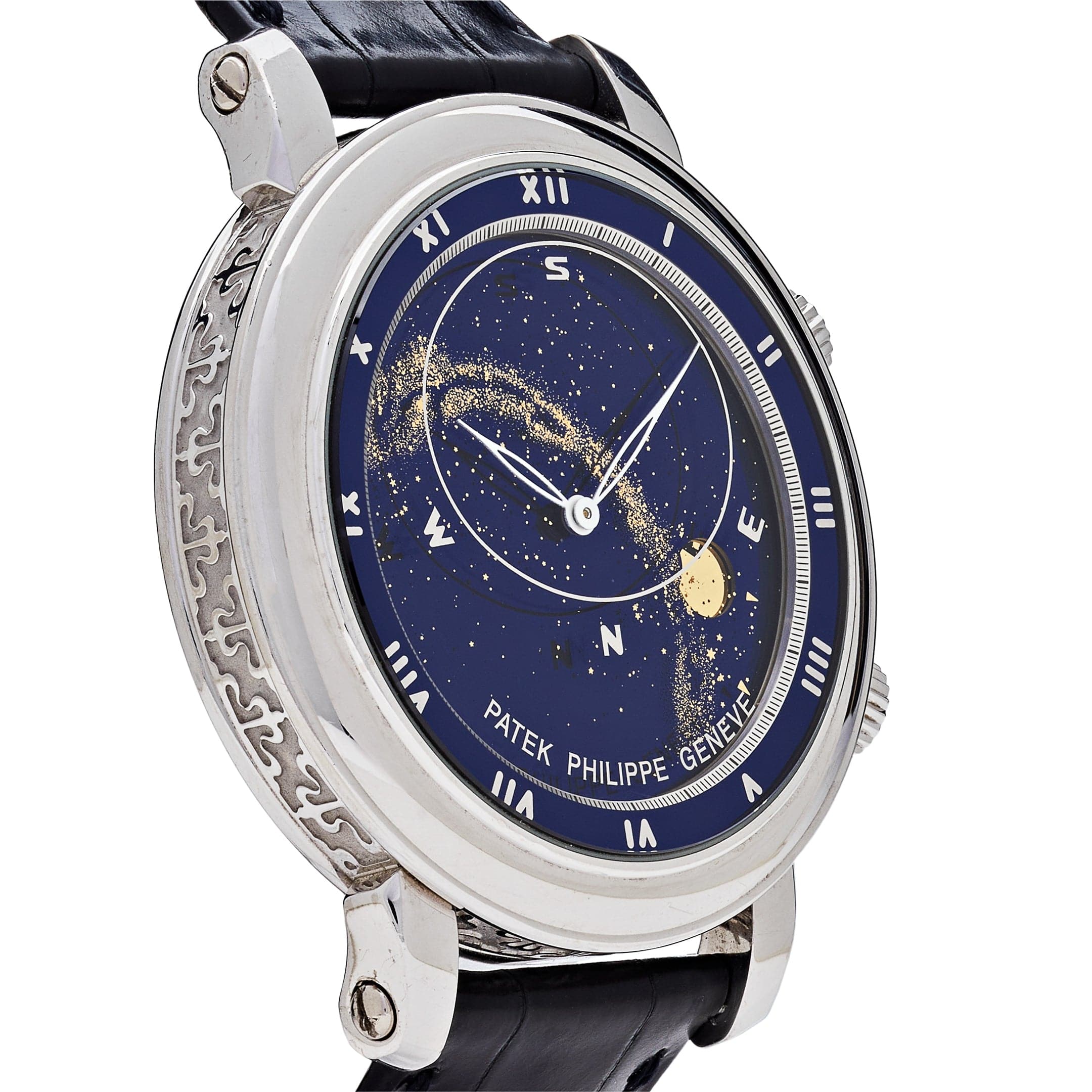 This Patek Philippe Celestial Grand Complications is crafted in a platinum case measuring 44mm. The dial features three metalized sapphire-crystal discs as well as ellipse framing the portion of the sky visible from Geneva. Other attributes include the date by hand, hours and minutes of mean solar time, a sky chart, phases and orbit of the Moon�and time of meridian passage of Sirius and of the moon. The watch comes on a shiny navy blue alligator leather strap and fold-over clasp.