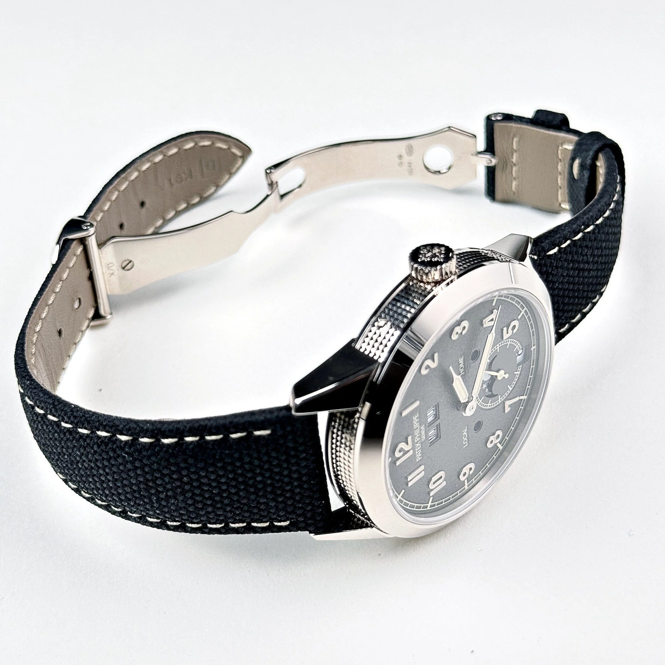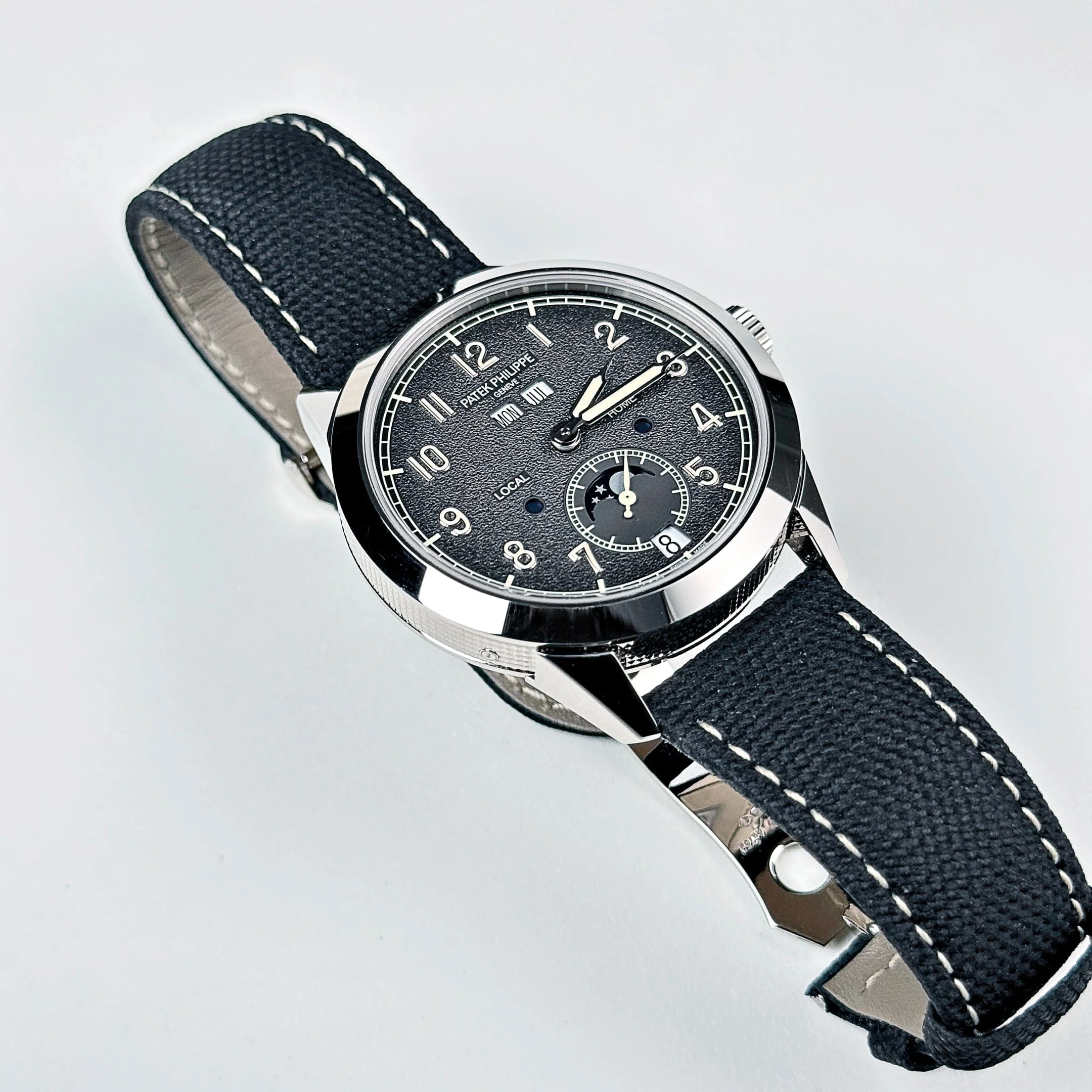 The Patek Philippe 5326G-001 combines refined elegance with practical functionality, crafted in white gold and showcasing a unique textured grey dial. This 2024 release features an annual calendar and travel time complication, designed for collectors who value both style and utility. The two complications work seamlessly together, offering an easy-to-read layout that��s intuitive and ideal for frequent travelers.