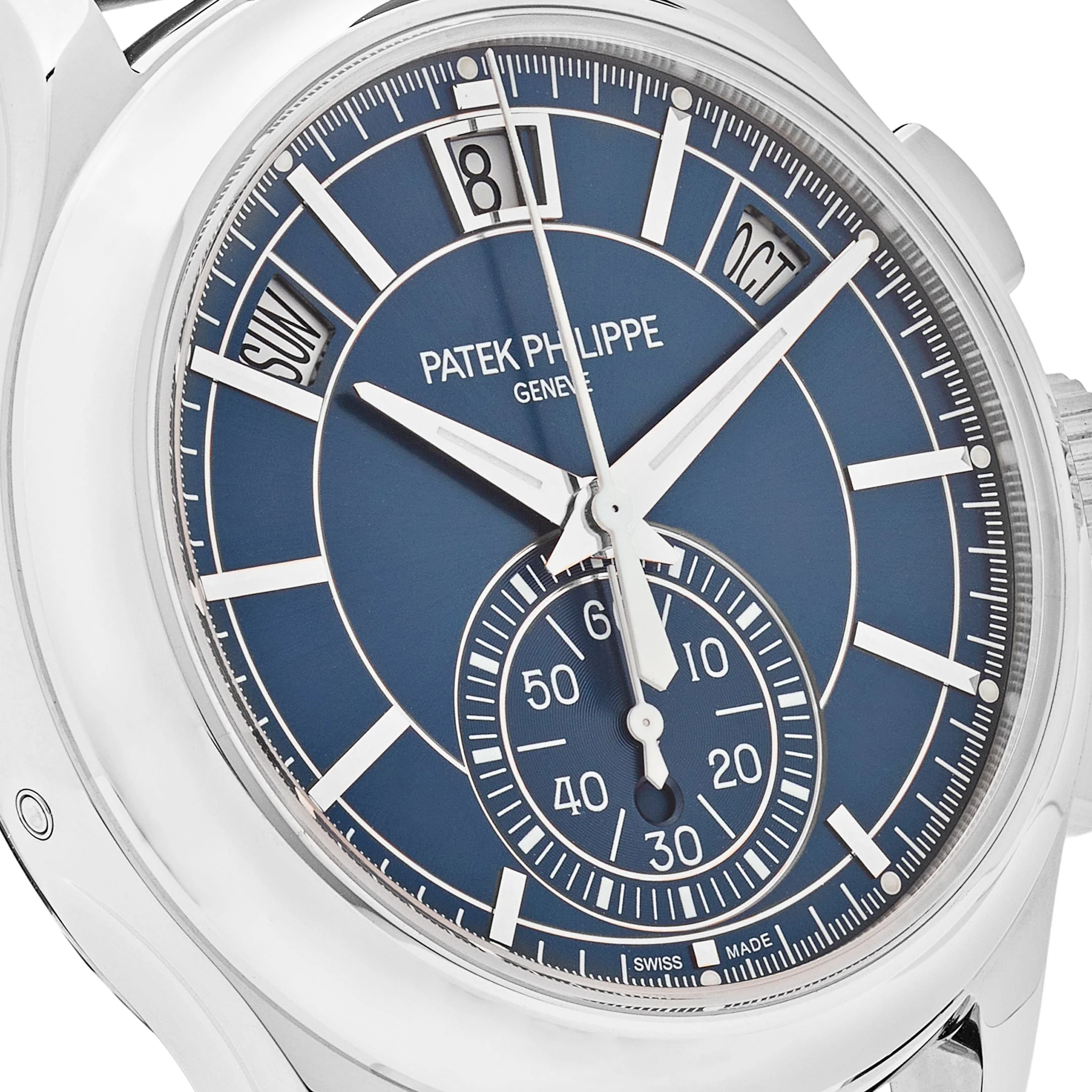 The Patek Philippe Flyback Chronograph unites two complications into one--a self-winding flyback chronograph and a patent Annual calendar. Designed with a 42mm platinum case and blue sunburst dial, it features a date/night display. Because the vertical clutch is virtually friction-free, the center chronograph hand can also serve as a permanent seconds hand. It is finished with a sapphire-crystal back, blue alligator strap and prong buckle.