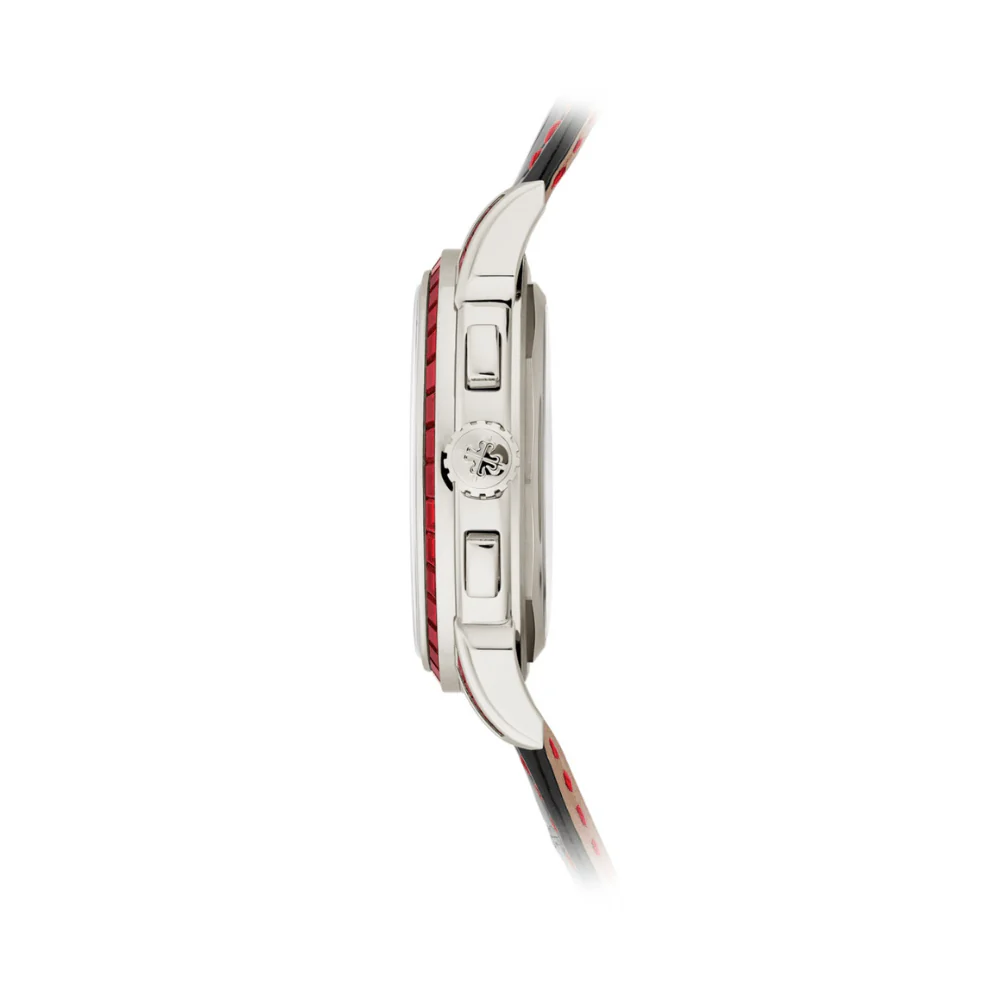 Paying tribute to an iconic Grande Complications, Patek Philippe has created a jewelry version of its chronograph with perpetual calendar Reference 5271, enhanced by 80 baguette-cut rubies (5.25 cts) set on the bezel, the lugs and the fold-over clasp. The intense color of the gems is echoed by the lacquered red dial with black-gradient rim and the shiny black alligator strap with contrasting stitching. Manually wound mechanical movement, platinum case.�