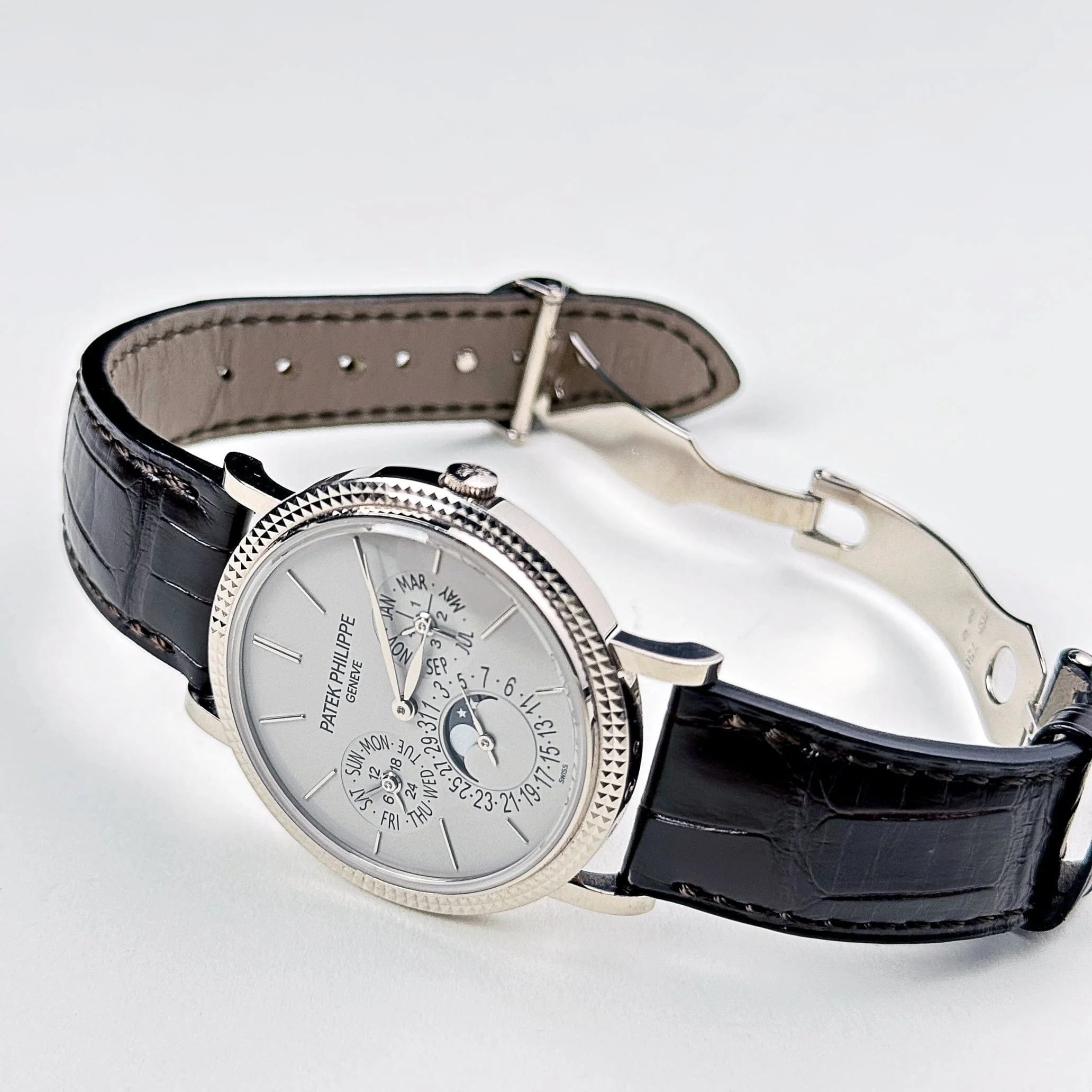 The Patek Philippe� 5139G-001 Perpetual Calendar in white gold with a silver dial (2008) is a refined timepiece that combines classic elegance with advanced horology. The white gold case complements the subtle silver dial, which features a full perpetual calendar complication, offering precise tracking of the date, day, month, and moon phase. Released in 2008, this model is highly sought after for its rarity and exceptional craftsmanship, making it a coveted piece for collectors who value both precision and timeless design.