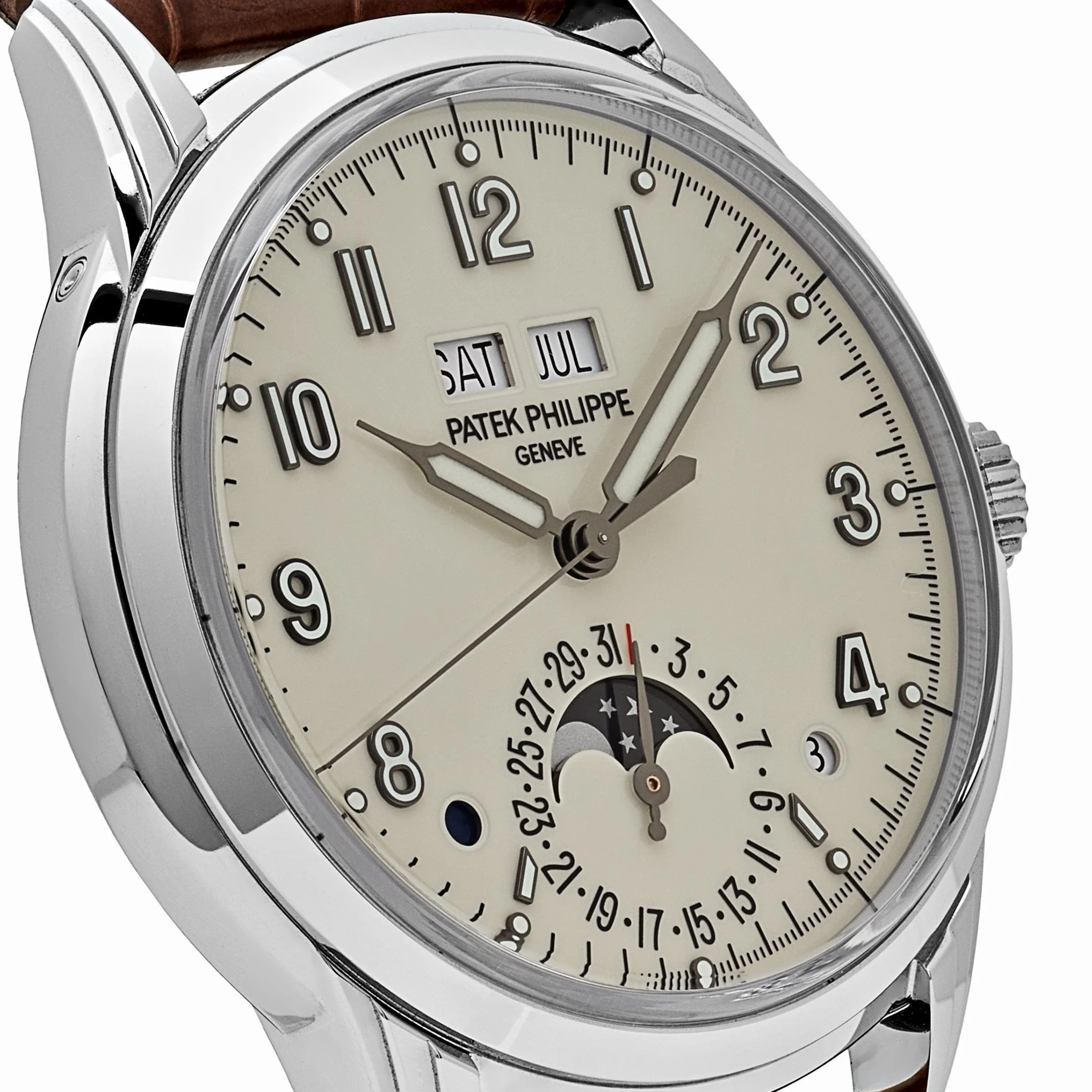 The Patek Philippe 5320G-001 Perpetual Calendar in white gold with an ivory dial (2022) is a stunning example of timeless design and intricate craftsmanship. The white gold case frames a sophisticated ivory dial, featuring the classic perpetual calendar complication with day, date, month, and moonphase indicators. The elegant combination of vintage aesthetics and modern precision makes this timepiece a rare and coveted piece for collectors. Released in 2022, it offers both functionality and luxury, blending traditional watchmaking with Patek Philippe��s signature refinement.