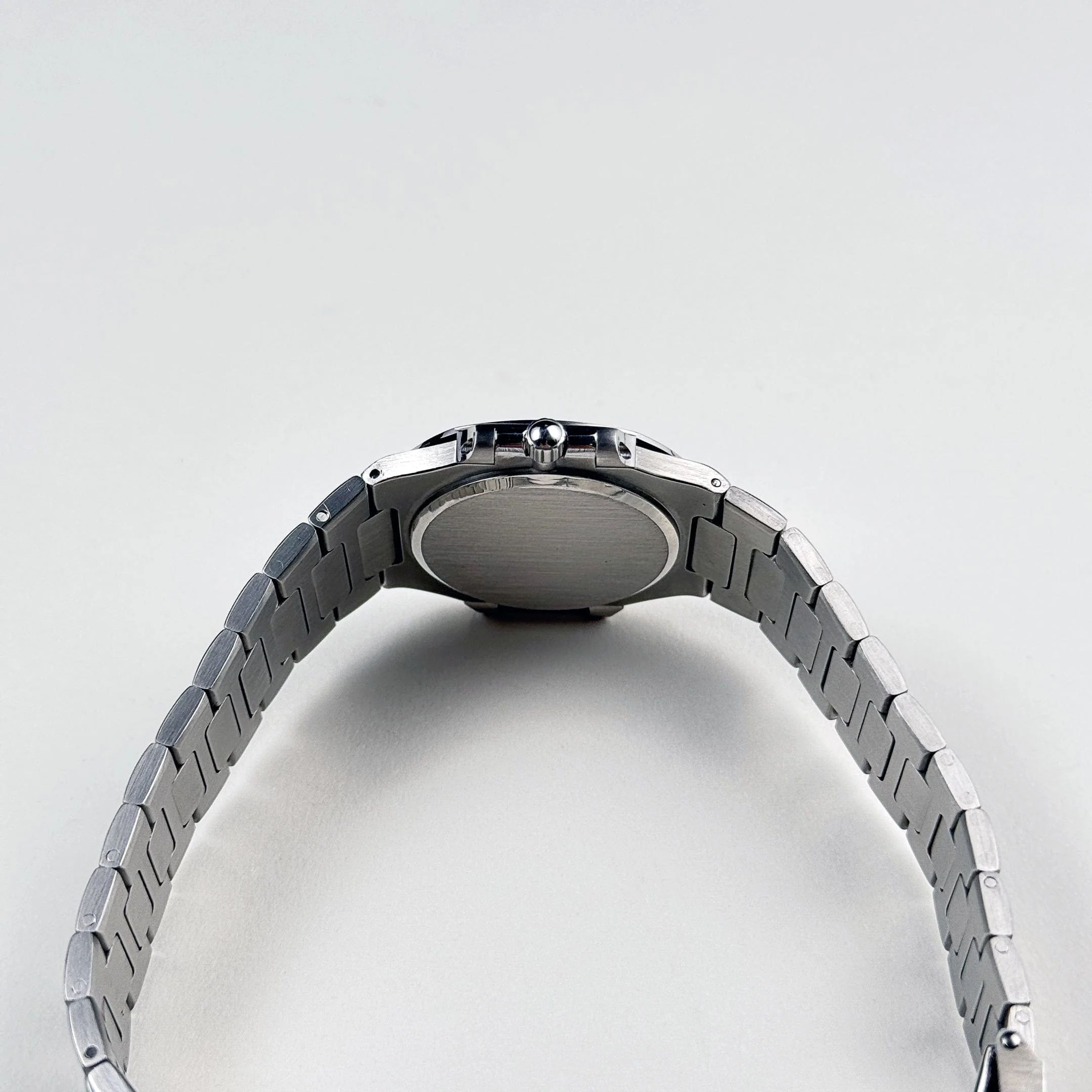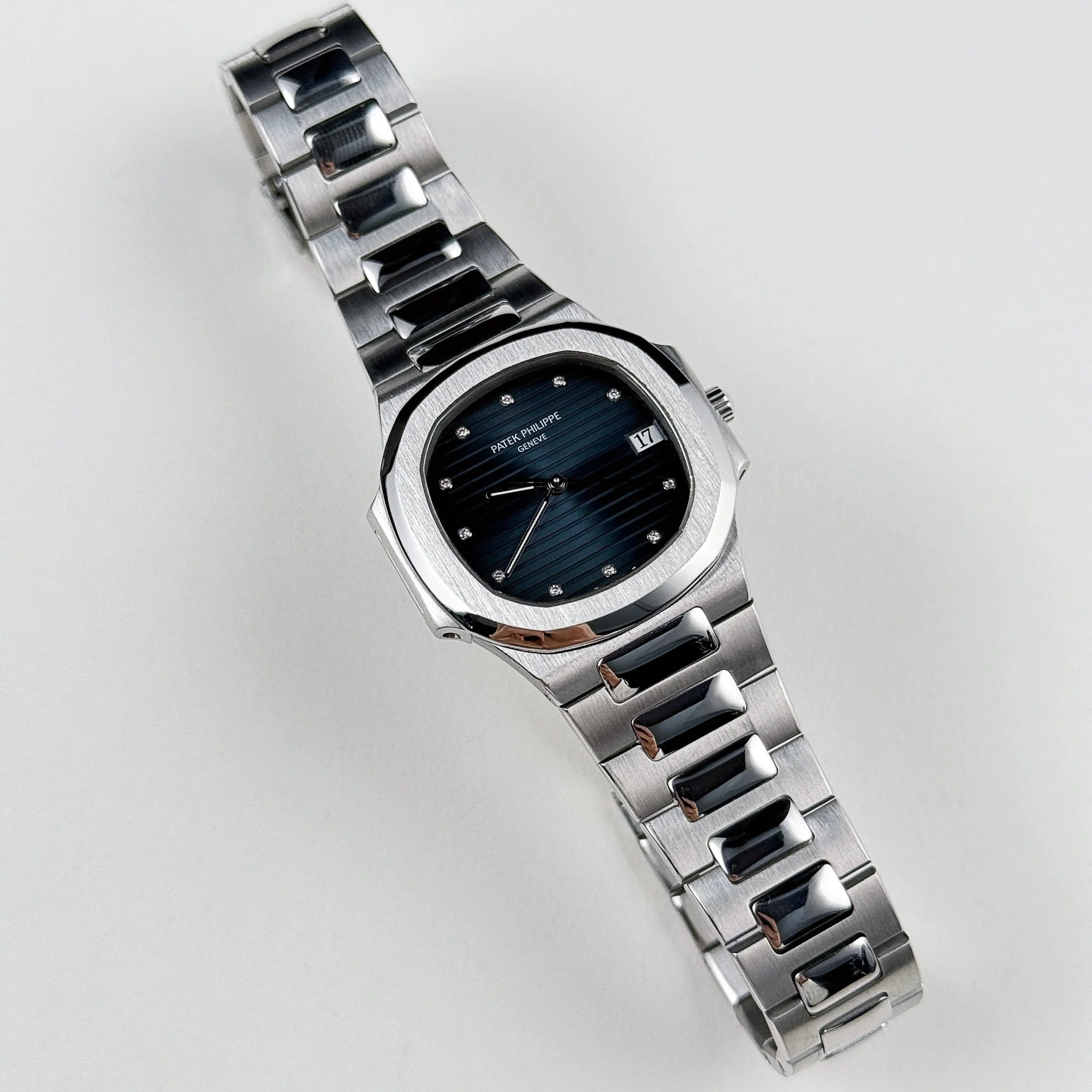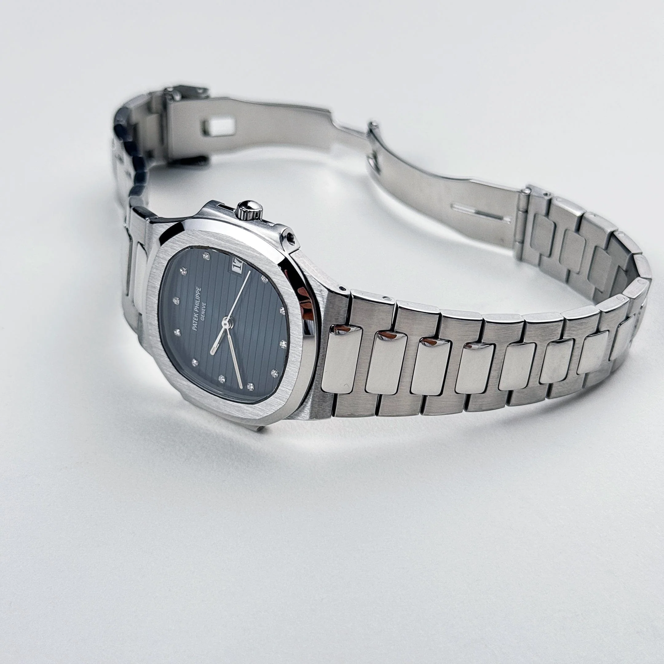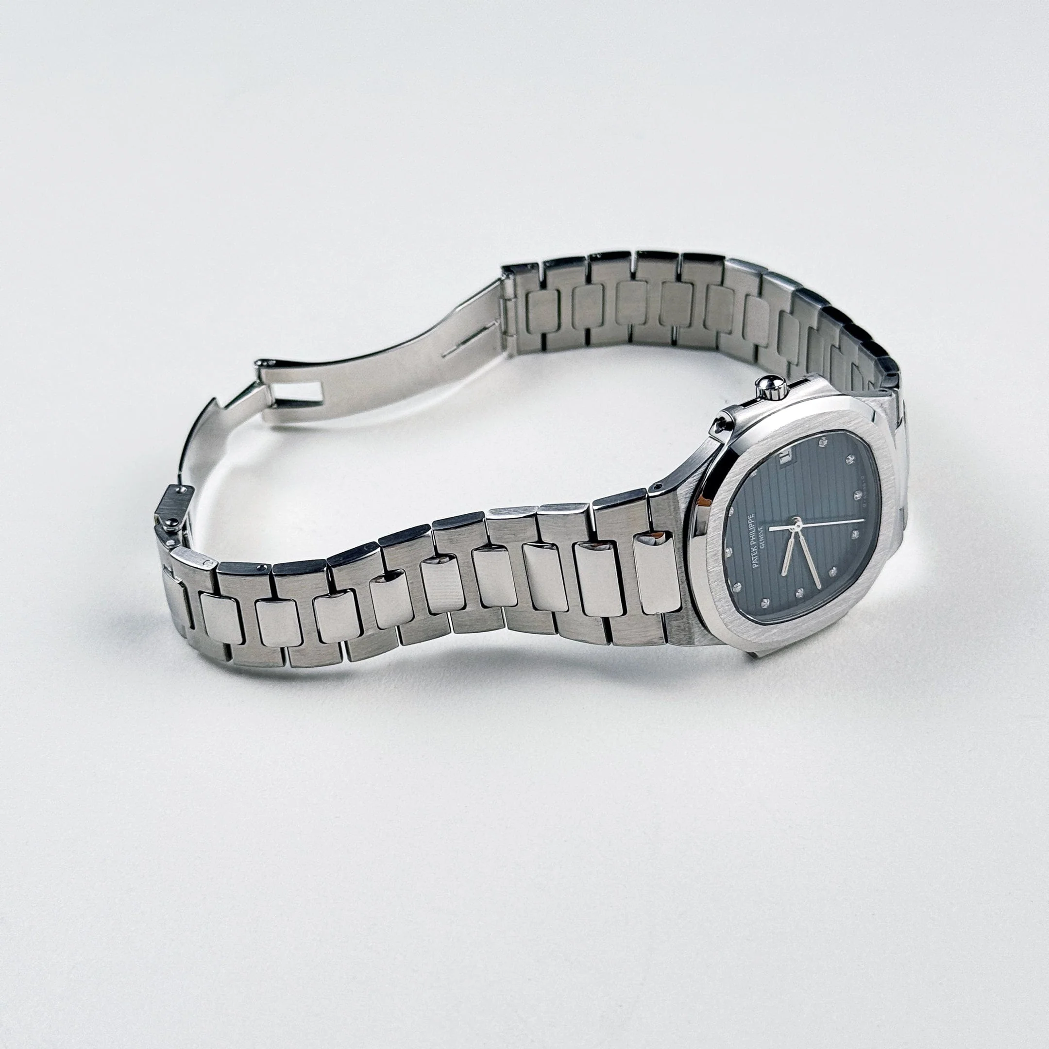 The Patek Philippe 3900/1A 'Ladies' Quartz in stainless steel with a blue dial combines the timeless Nautilus design with the convenience of quartz movement. The vibrant blue dial adds a modern pop of color to the classic stainless steel case, making it a versatile and elegant piece. Ideal for those seeking a sleek, high-quality timepiece with the precision of a quartz movement.
