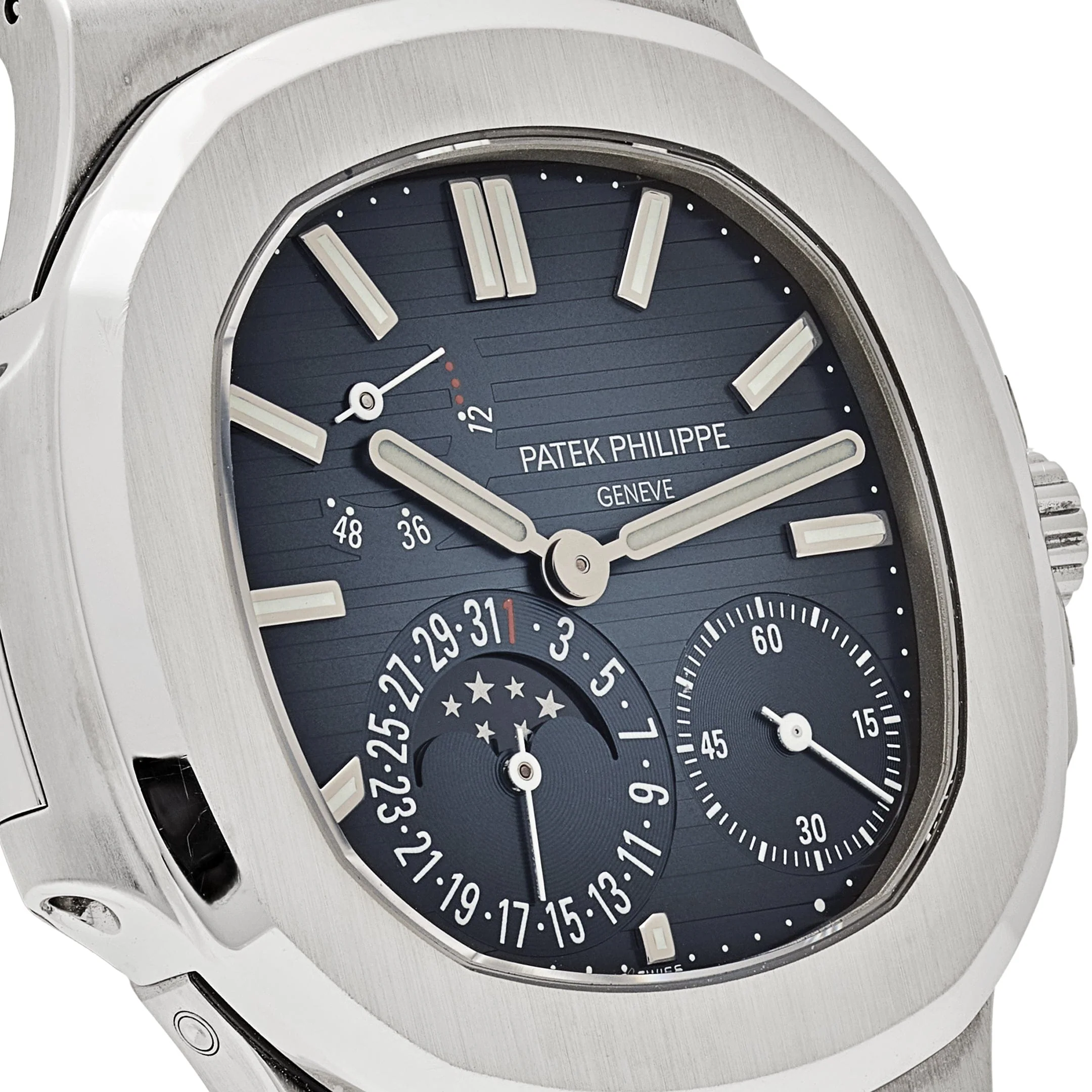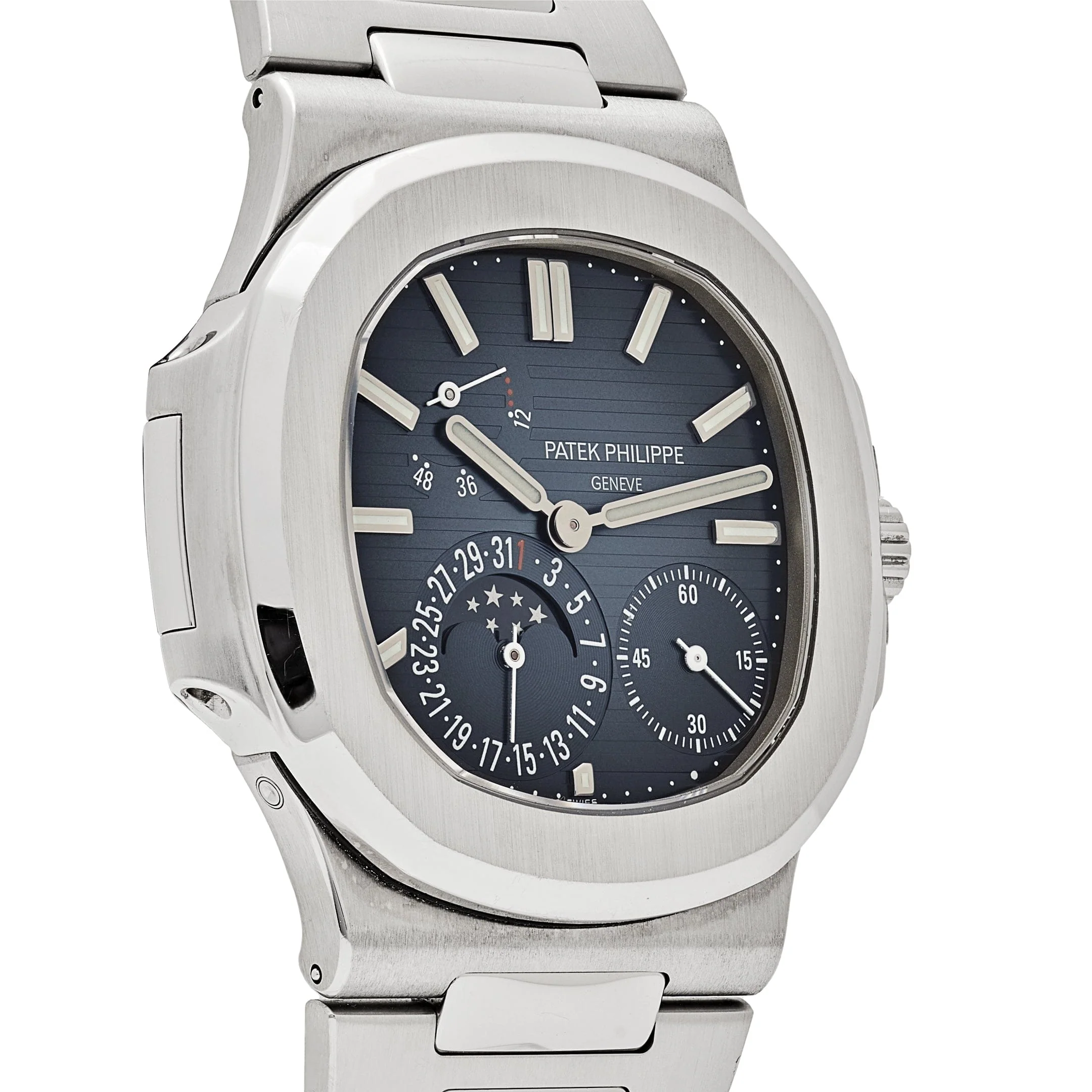 The Patek Philippe 5712/1A-001 in stainless steel with a blue dial and moon phase complication is a celebrated model within the Nautilus collection. The blue dial, with its elegant complications, including and power reserve, enhances the allure of this limited-production piece.�