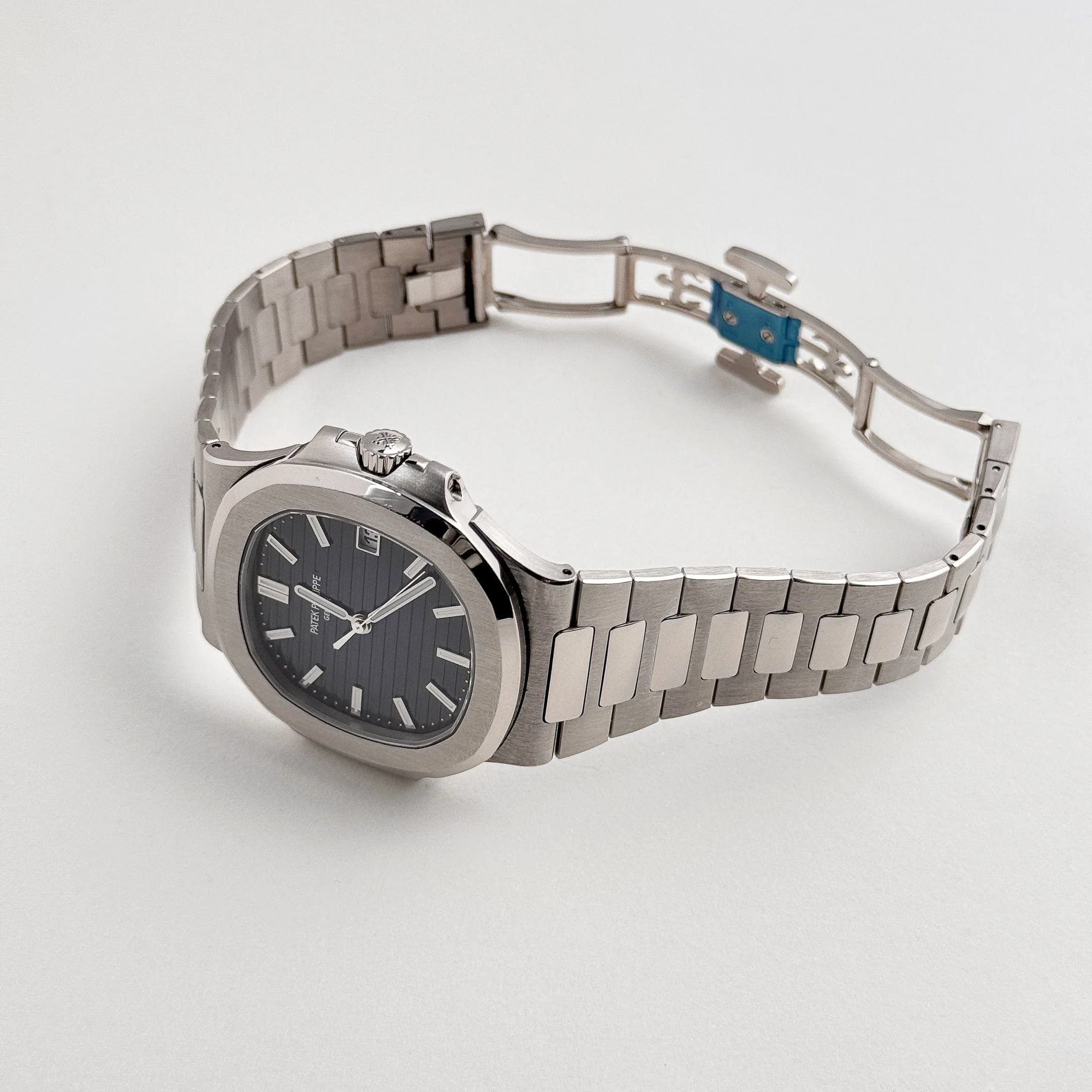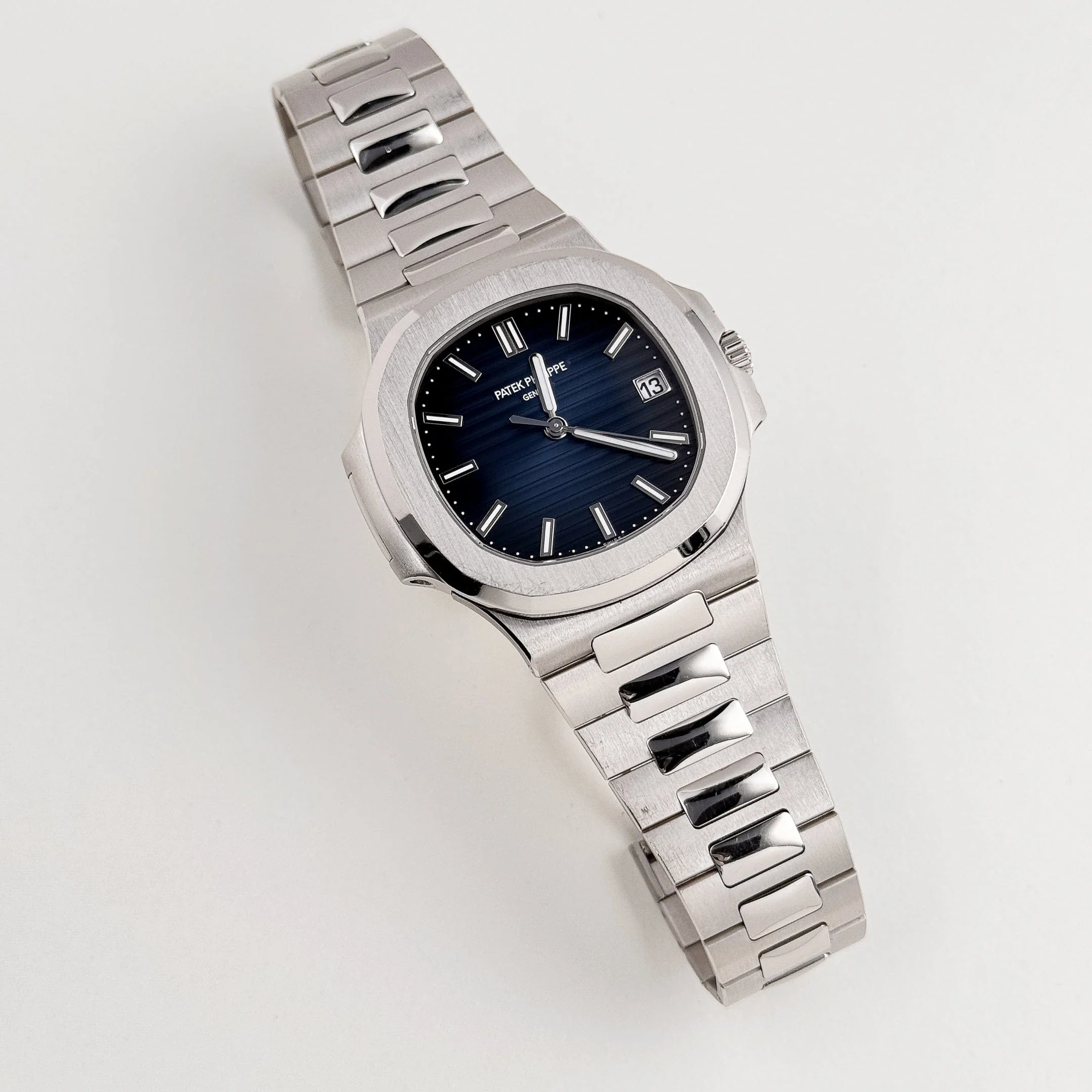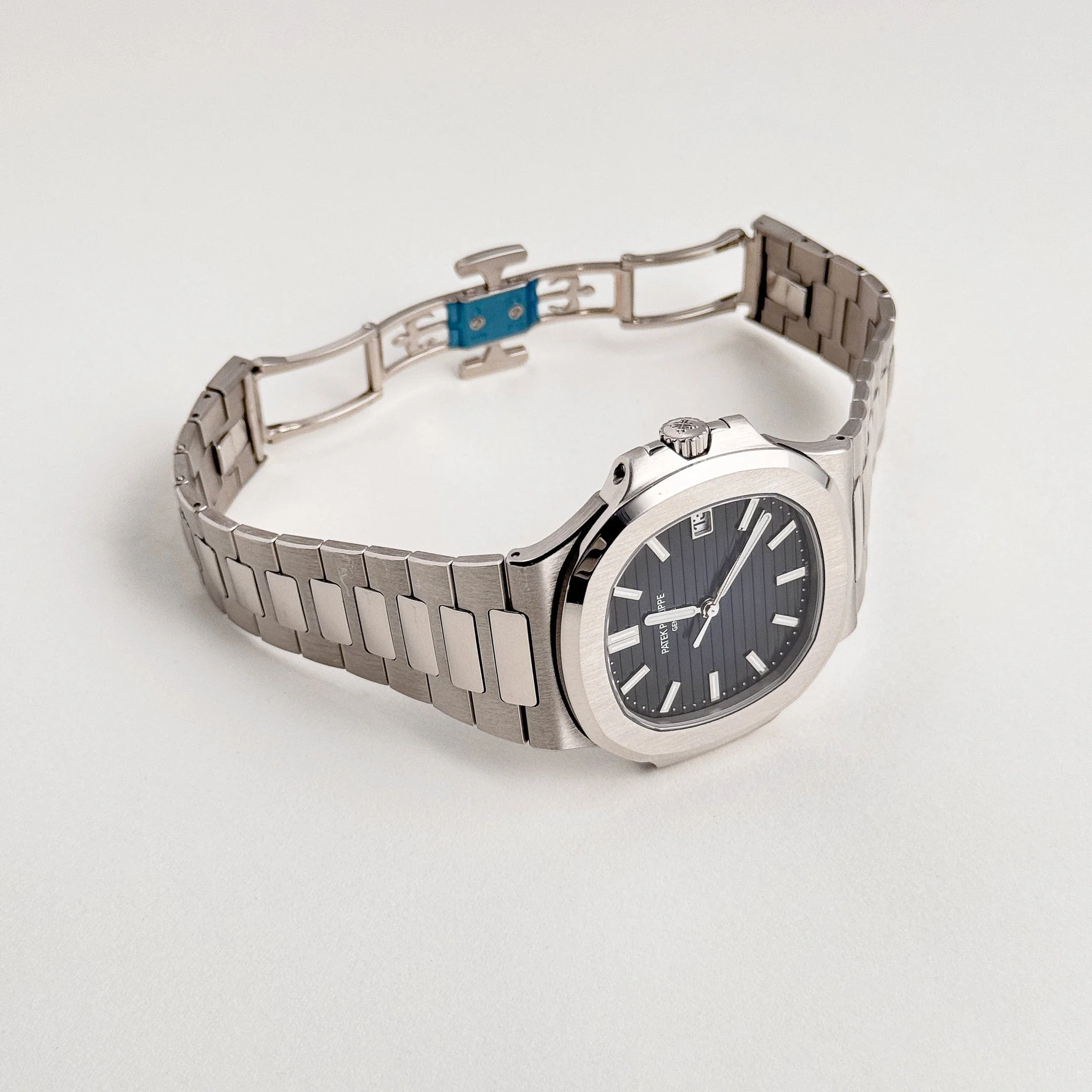 The Patek Philippe 5811/1G-001 is a modern yet timeless update to the brand’s iconic luxury sports watch. Crafted in 18k white gold, the 41mm case showcases the hallmark porthole-inspired design with a refined polished and satin-brushed finish. Its blue sunburst dial features subtle horizontal embossing, providing a rich texture and a captivating play of light. The white gold applied hour markers and hands, filled with luminescent coating, ensure legibility while maintaining the Nautilus’s understated elegance.