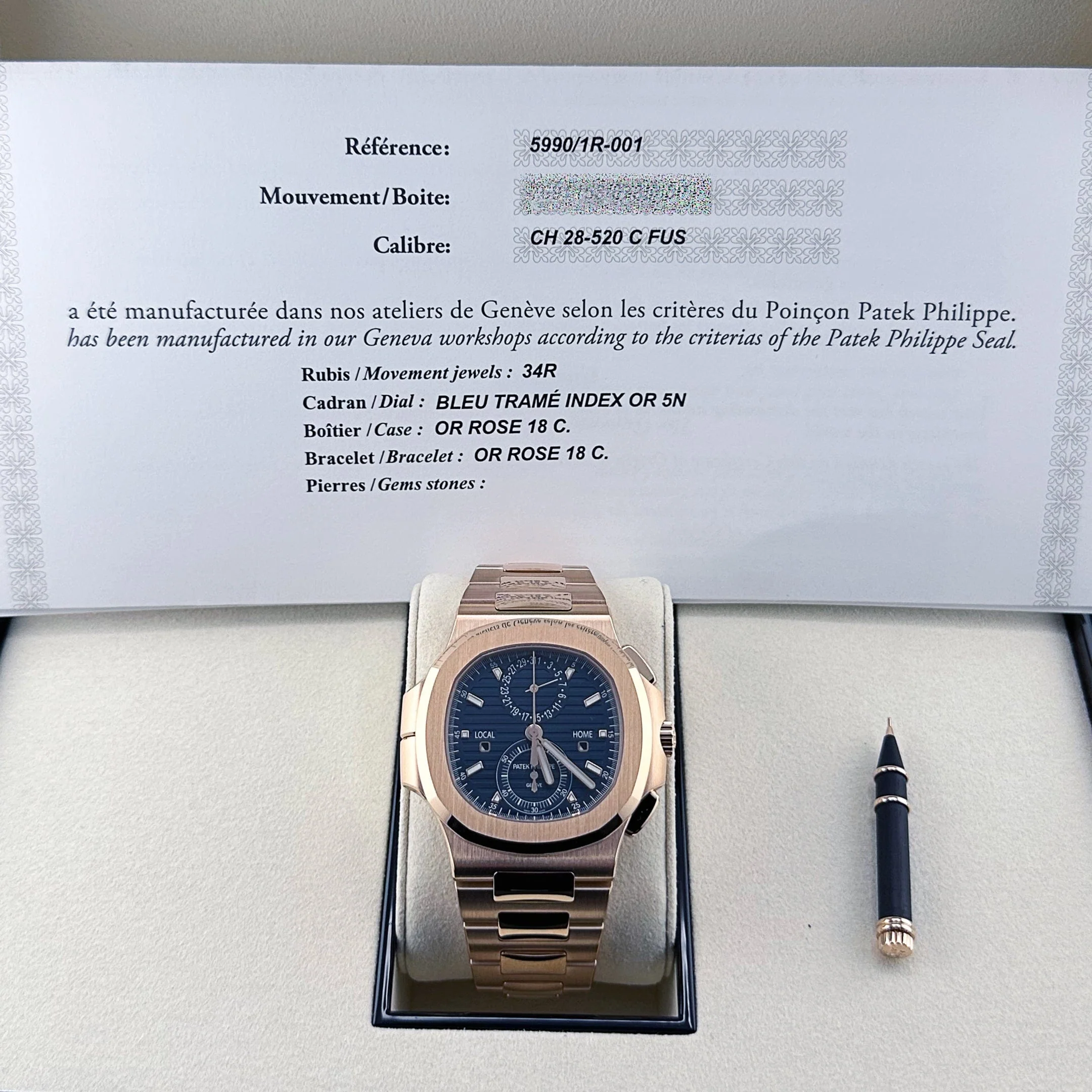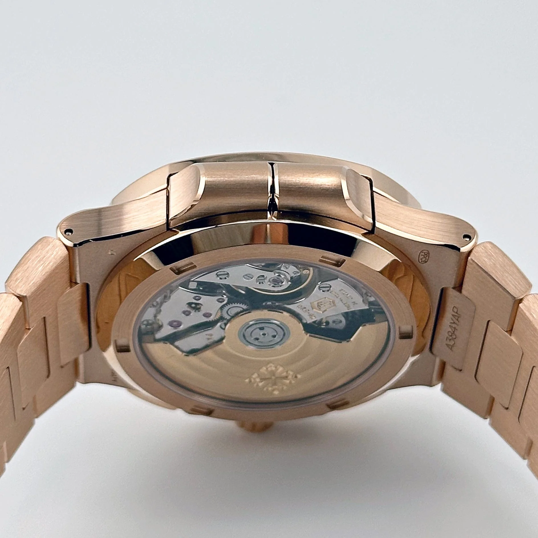 This Patek Philippe Nautilus Travel Time Flyback Chronograph features a 40.5mm rose gold case and sapphire-crystal case back. The dial is designed in a sunburst blue with gold applied hour markers with luminescent coating. The watch comes on a rose gold bracelet and a nautilus fold-over clasp.
