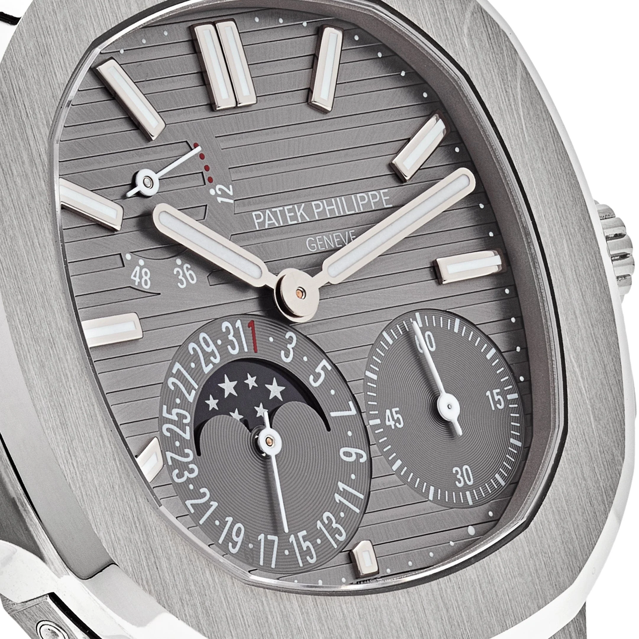 The Patek Philippe 5712G-001 is designed in a 40mm 18k white gold case, styled on a leather strap. The slate gray dial hosts three sub-dials: a power reserve indicator, seconds hand, and Moon Phase timekeeping capabilities. A subtle and simple sports watch with high-end complications.