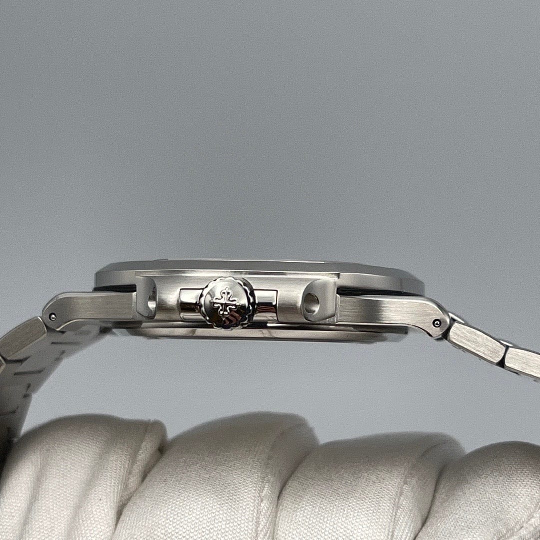 This Patek Philippe Nautilus features a distinctive shape of the octagonal bezel with its softened angles accentuated by a row of 32 internally flawless Top Wesselton baguette-cut diamonds (~3.6 cts). This timepiece features a 40mm x 38mm stainless steel case surrounding a dial designed in horizontally embossed sunburst olive-green, gold applied hour markers with luminescent coating. It is finished on a stainless steel bracelet with a fold-over clasp.