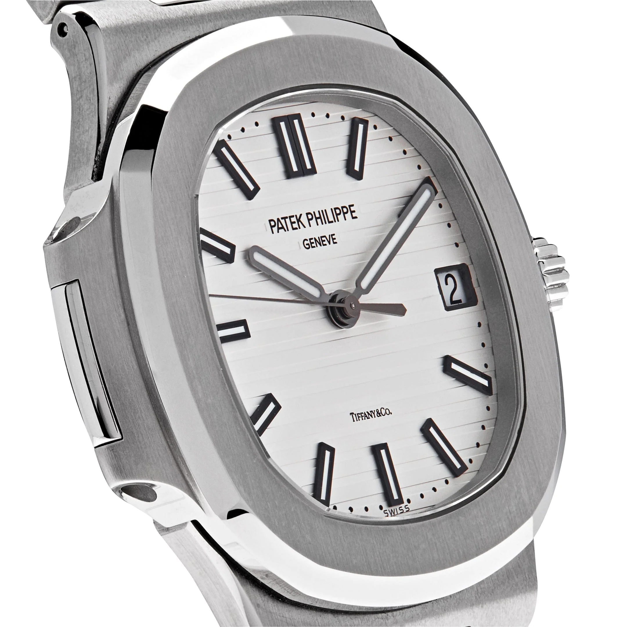 The Patek Philippe Nautilus features a 40mm x 38mm stainless steel case surrounding an embossed white dial with the Tiffany & Co. logo. The highly recognizable design of the case, bezel and bracelet are enhanced by a subtle alternation between satinated and polished manual finishing. It is finished on a stainless steel bracelet and fold-over clasp.