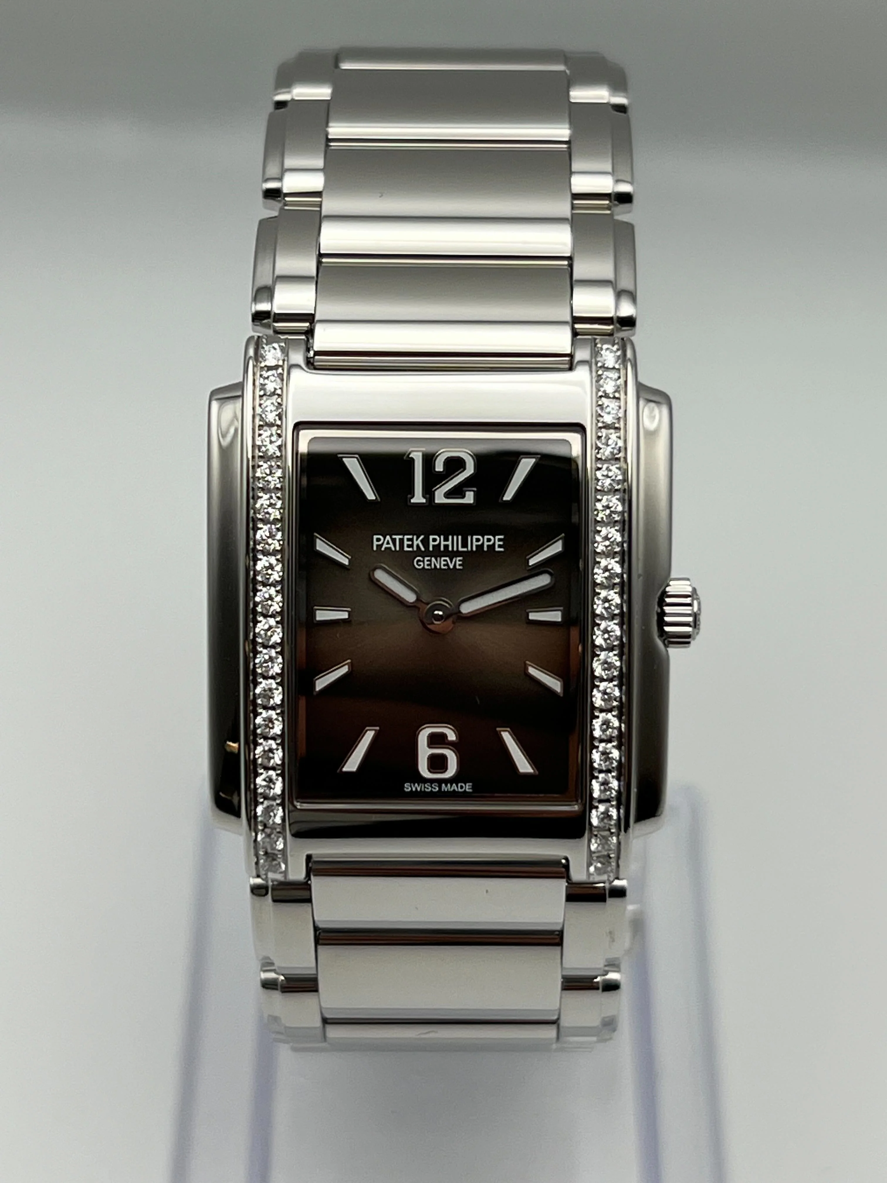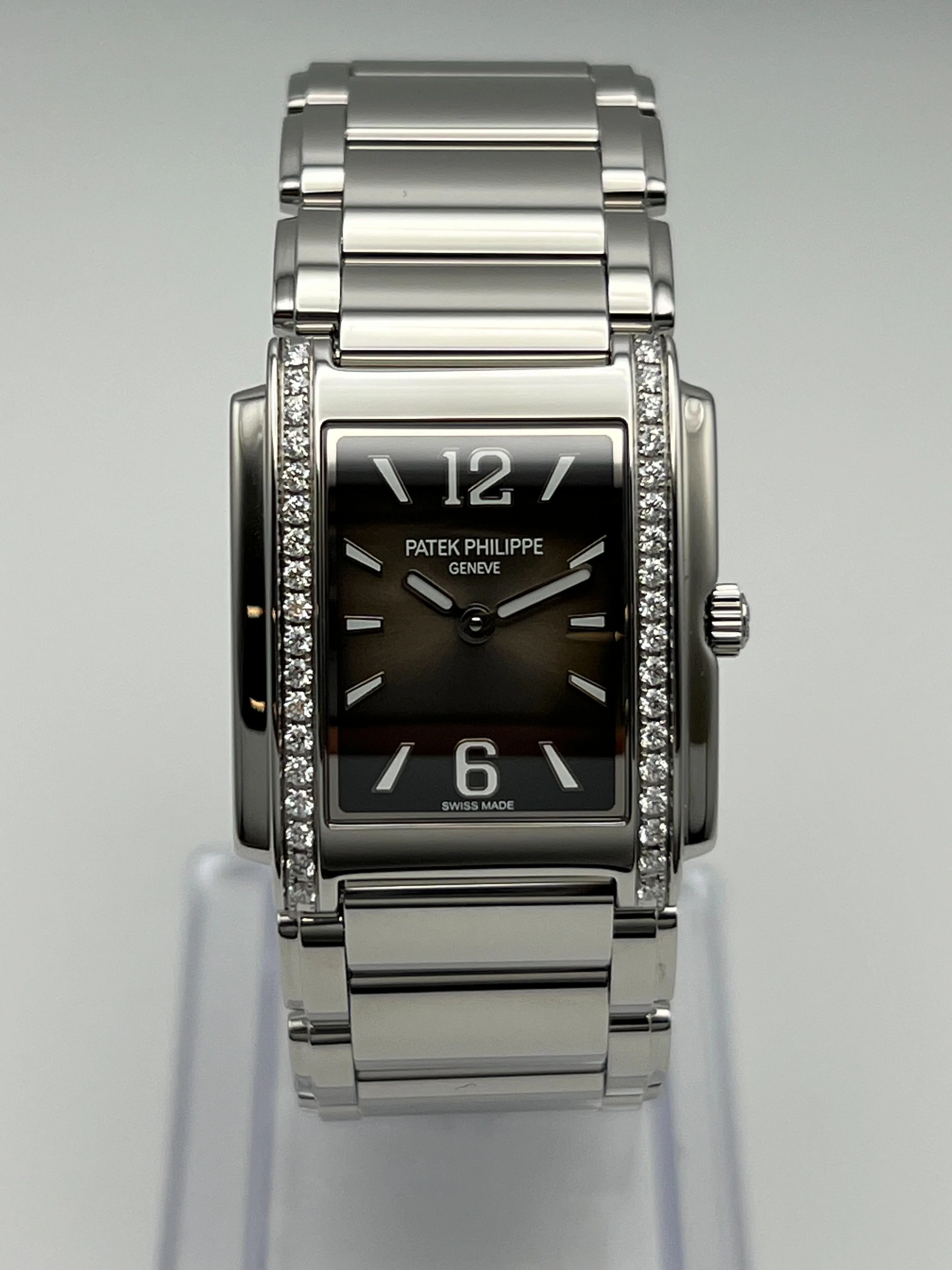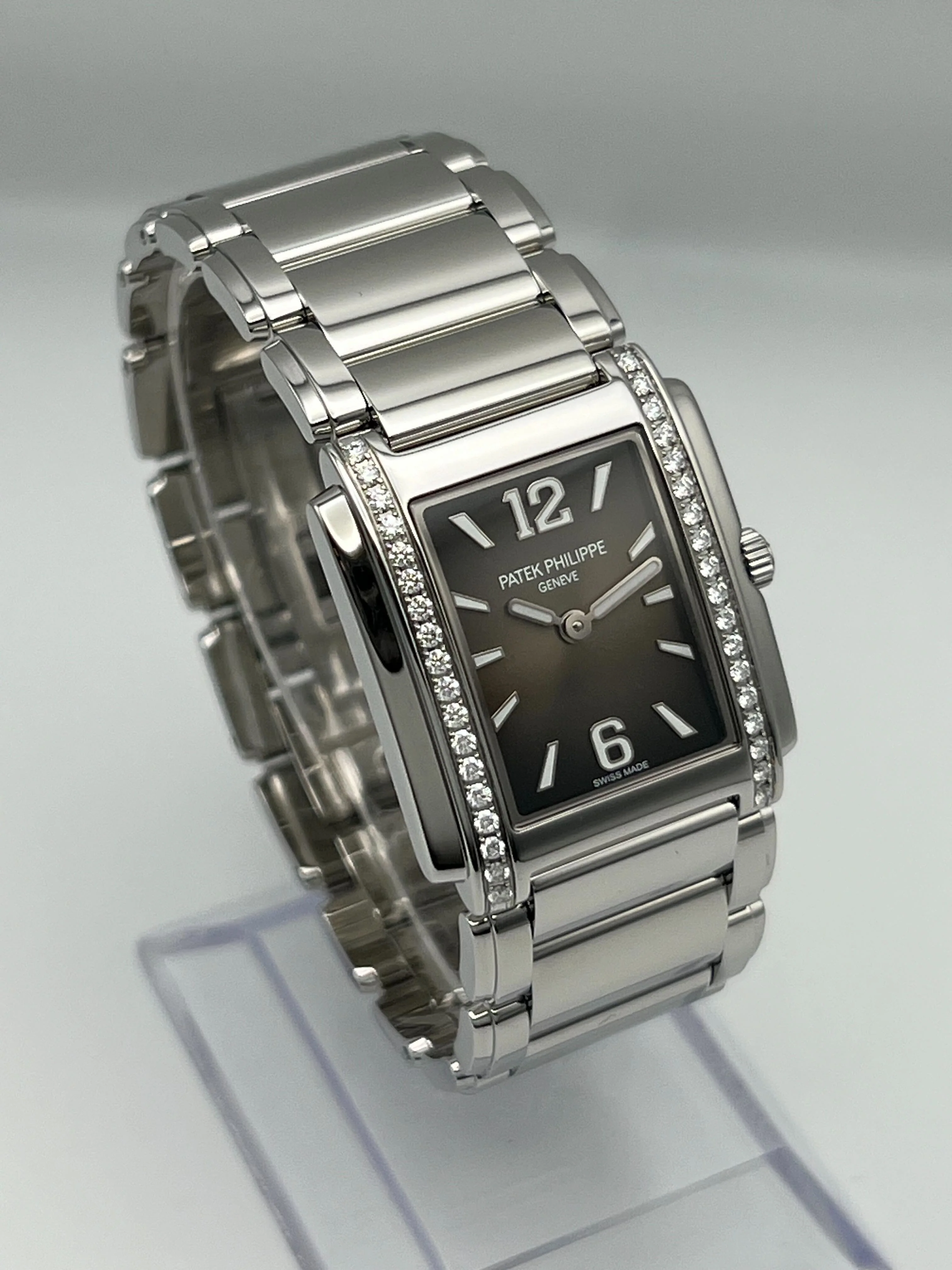 This Patek Philippe Twenty-4 Ladies�features a reliable Quartz movement encased in durable Stainless Steel, complemented by a matching Stainless Steel bracelet for a refined and enduring aesthetic. The Gray Sunburst dial adds a contemporary touch to its classic design. With a modest case diameter of 25mm, the Twenty-4 is subtly sophisticated, making it suitable for any occasion.�