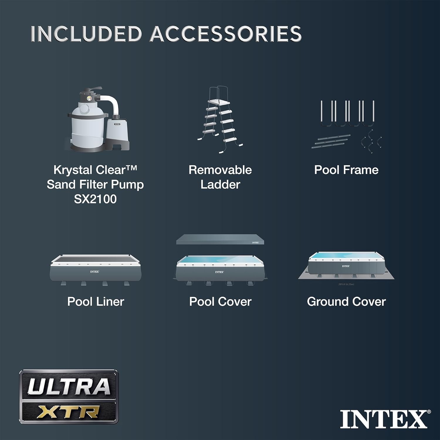 Maximize your pool experience with our largest Ultra XTR™ Frame pool. Classic rectangular shape, elegant graphite liner with water-blue tile print interior and brilliant white copings will make a fashion statement anywhere. Have an amazing time with family and friends with the spacious pool. This top-of-the-line above ground pool combines high-quality with style offering ease of ownership so that your pool time is truly fun time. It comes with a 2-year warranty on pool liner, frame and filter pump.