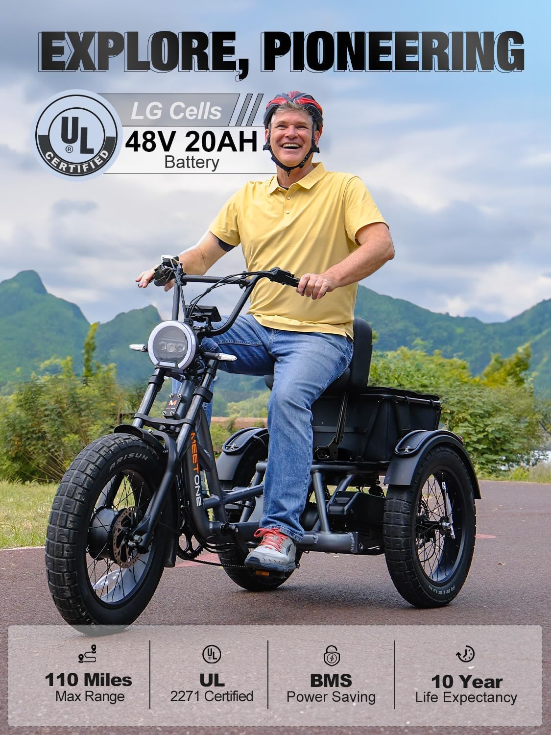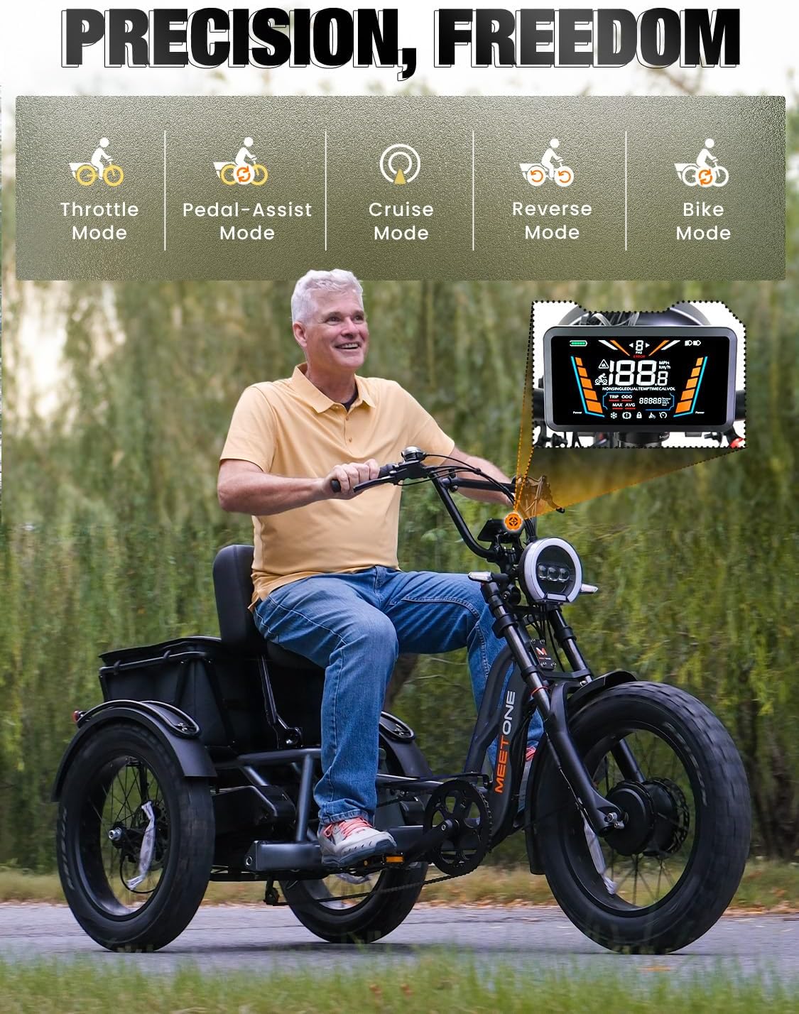 | Included Components | �� 1× MEETONE TOUR Electric Tricycle �� 2× 48V 15AH SAMSUNG Cells Batteries (Total 30AH) �� 2× Fast-Charging Chargers �� 1× Oversized Semi-Recumbent Backrest �� 1× Rear Basket with Liner Bag �� 1× A Pair of Handlebar Mirrors �� 1× Cable Lock �� 1× Tool Kit �� 1× Spare Paint �� 1× User Manual �� 1× Quick Start Guide |