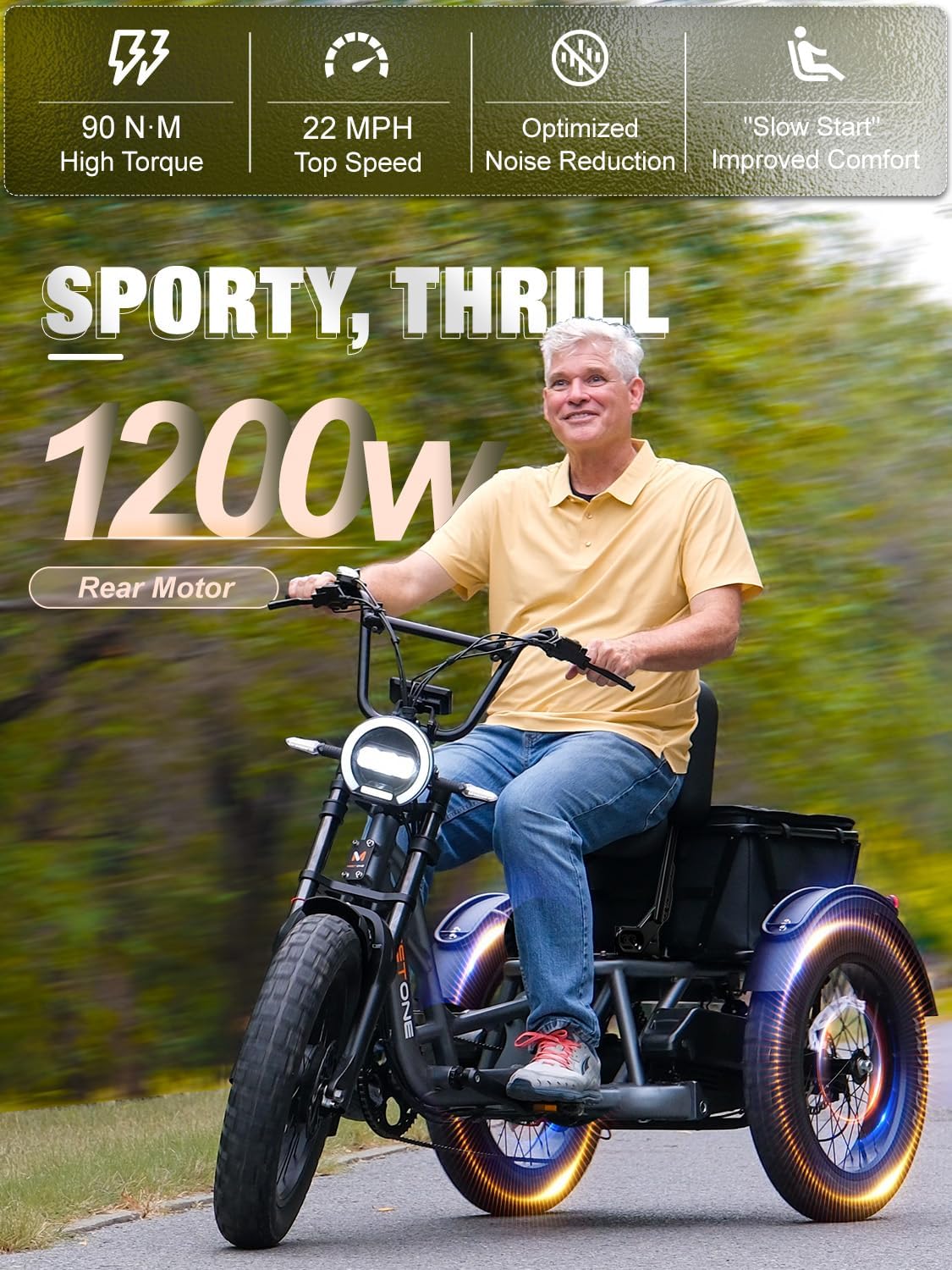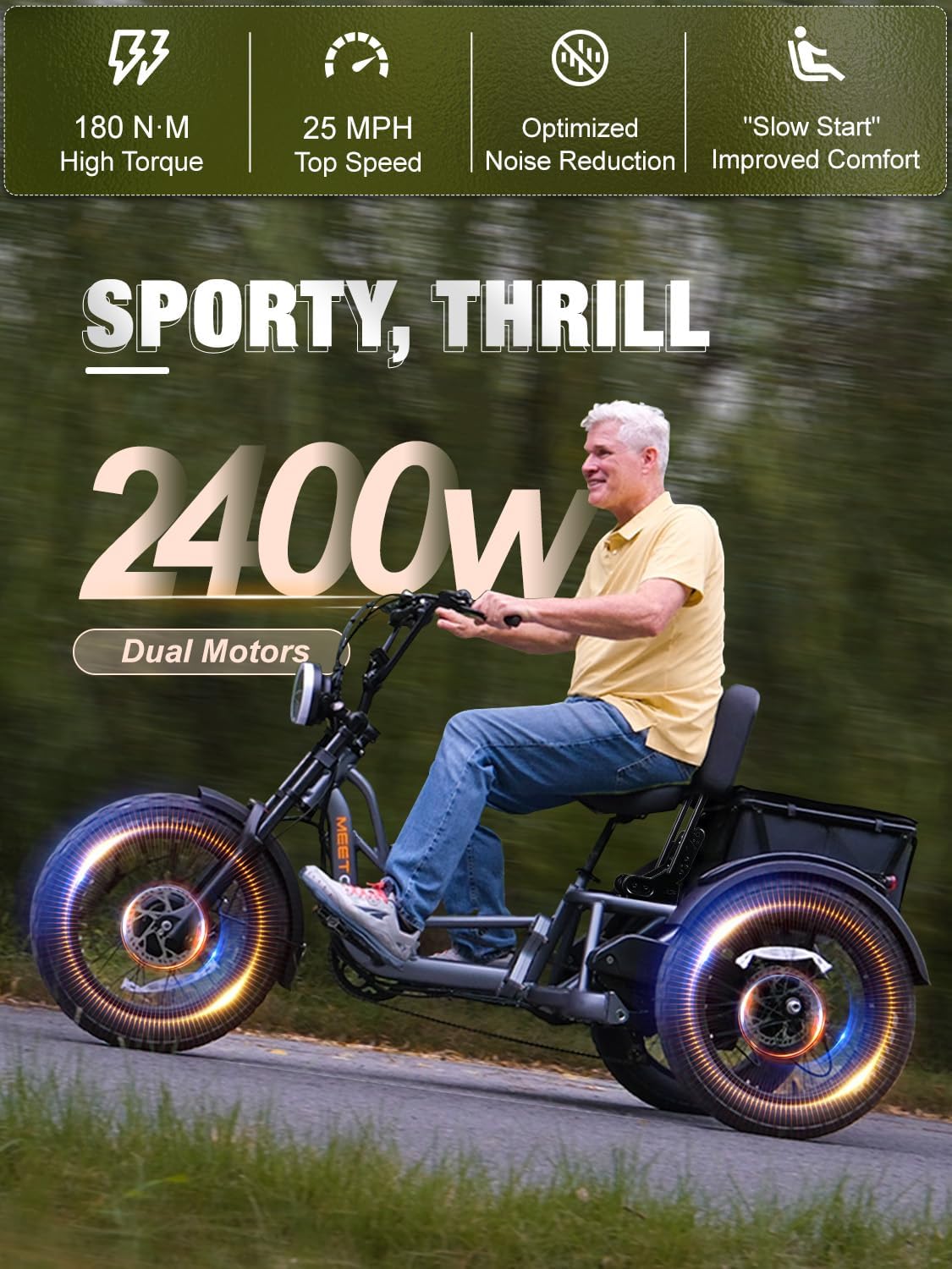 - ROBUST DRIVE --- The TOUR Electric Tricycle combines power, dynamics, efficiency and altitude. Fitting with 2400w dual high-performance motors to produce up to 25mph top speed and 180 N·m. responds sensitively to your riding behaviour and ensures smooth start-up. Extreme durability and efficient works allows heavy use, particularly in combination with 48V 30AH Dual SAMSUMG cells Batteries, 130 Miles max range makes it the ideal choice for longer tours, as its name suggests.