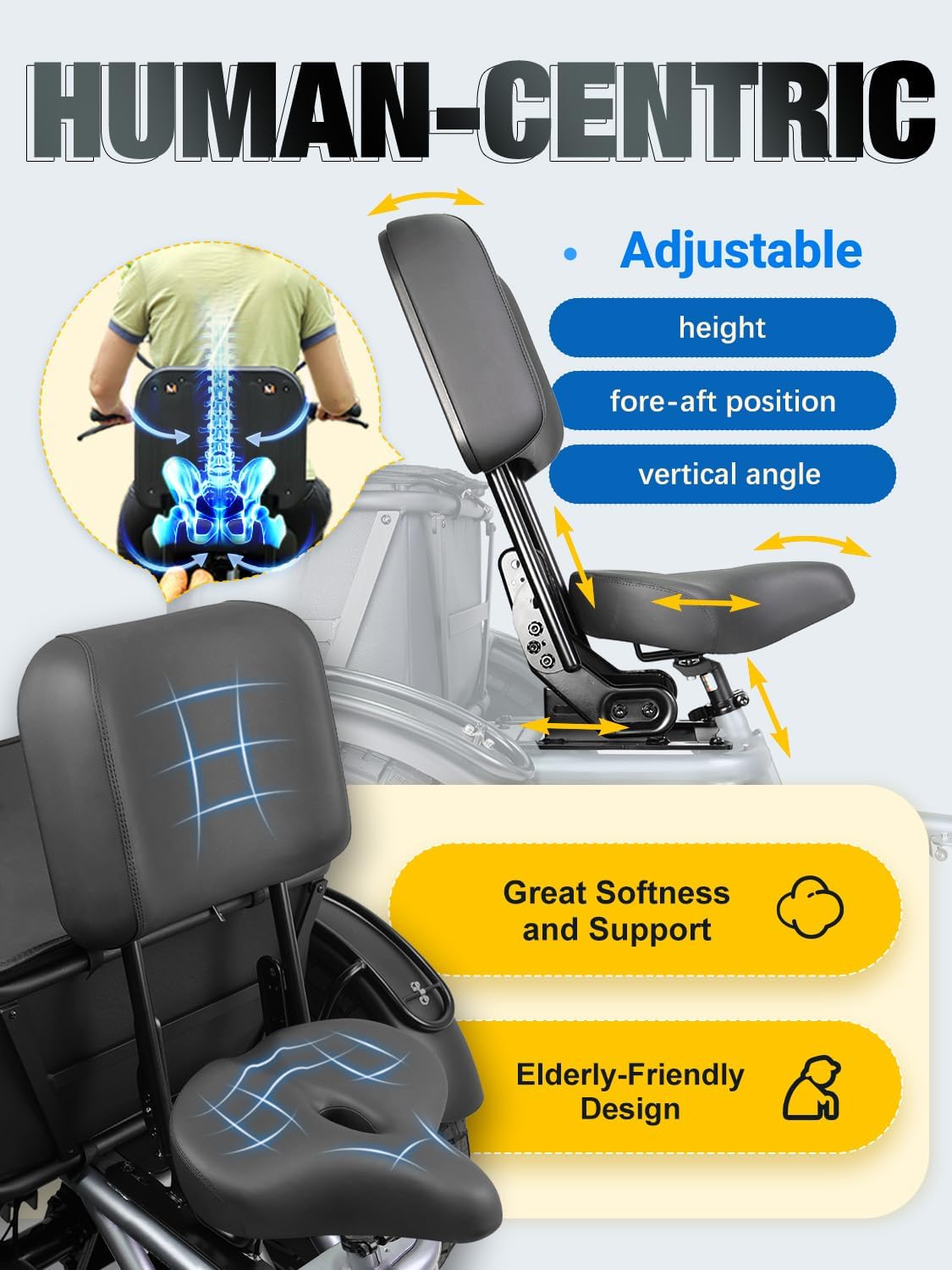 - COMFORT REDEFINED --- MEETONE debuted a radically new concept of "SEMI-RECUMBENT" riding posture. Ergonomic extra wide saddle with backrest, and pedals with front-mounted design, sets a formidable new standard for comfort. Backrest and saddle are 6-way adjustable, extra arc wide design for optimal even pressure distribution, greatly releases pressure on the back and tailbone, is particularly friendly to the seniors and users with limited mobility. Enjoy the ultimate comfortable riding experience