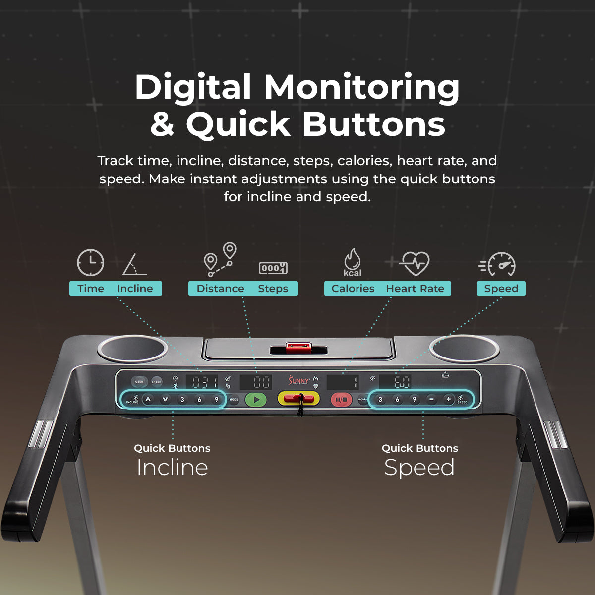 Built to last, this treadmill supports up to 300 LB and includes a heavy-duty frame along with a double-deck shock absorption system to minimize joint impact. It boasts 24 pre-set workout programs, 3 countdown modes, and 3 user modes to cater to all fitness levels, from beginner to advanced. The advanced LED display ensures easy tracking of metrics with quick speed and incline adjustments. For connected fitness, the free SunnyFit app offers 2,000+ trainer-led videos, 10,000+ virtual tours, and more. Additional features include built-in pulse sensors, a device holder, two cup holders, and a USB charging port, all backed by over 20 years of excellence from Sunny Health & Fitness.